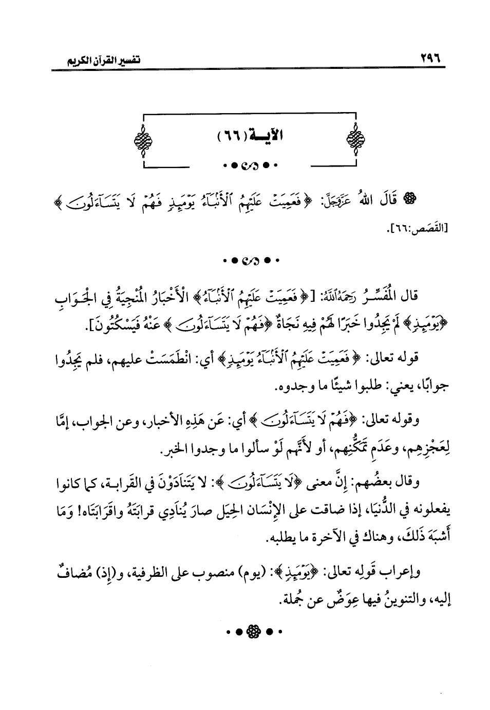 قال المُفَسِّرُ رَحِمَهُ اللَّهُ: [{فَعَمِيَتْ عَلَيْهِمُ الْأَنْبَاءُ} الْأَخْبَارُ المُنْجِيَةُ فِي الجْوَابِ {يَوْمَئِذٍ} لَمْ يَجِدُوا خَبَرًا لهمْ فِيهِ نَجَاةٌ {فَهُمْ لَا يَتَسَاءَلُونَ} عَنْهُ فَيَسْكُتُونَ].