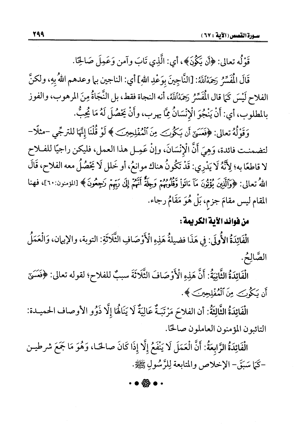 الْفَائِدَةُ الثَّانِيَةُ: أَنَّ هَذِهِ الْأَوْصَافَ الثَّلَاثَةَ سببٌ للفلاح؛ لقوله تعالى: {فَعَسَى أَنْ يَكُونَ مِنَ الْمُفْلِحِينَ}.