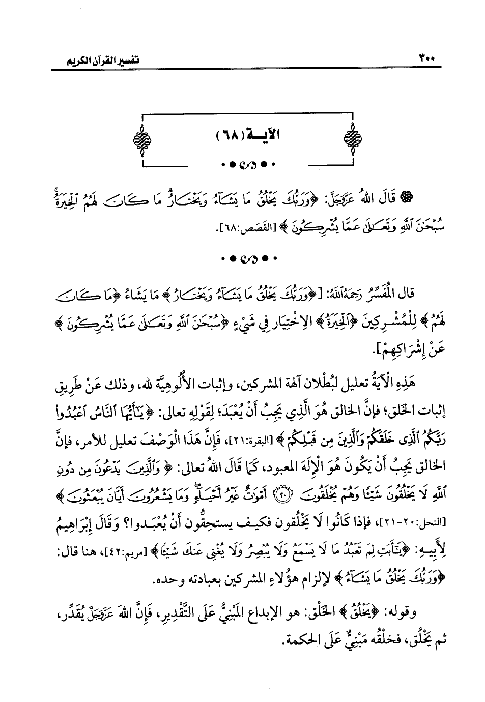 هَذِهِ الآيَةُ تعليل لبُطلان آلهة المشركين، وإثبات الأُلُوهِيَّة للَّه، وذلك عَنْ طَرِيقِ إثبات الخَلق؛ فإنَّ الخالق هُوَ الَّذِي يَجِبُ أَنْ يُعْبَدَ؛ لِقَوْلِهِ تعالى: {يَاأَيُّهَا النَّاسُ اعْبُدُوا رَبَّكُمُ الَّذِي خَلَقَكُمْ وَالَّذِينَ مِنْ قَبْلِكُمْ} [البقرة: ٢١]، فَإِنَّ هَذَا الْوَصْفَ تعليل للأمر، فإنَّ الخالق يَجِبُ أَنْ يَكُونَ هُوَ الْإِلَهَ المعبود، كَمَا قَالَ اللَّهُ تعالى: {وَالَّذِينَ يَدْعُونَ مِنْ دُونِ اللَّهِ لَا يَخْلُقُونَ شَيْئًا وَهُمْ يُخْلَقُونَ (٢٠) أَمْوَاتٌ غَيْرُ أَحْيَاءٍ وَمَا يَشْعُرُونَ أَيَّانَ يُبْعَثُونَ} [النحل: ٢٠ - ٢١]، فإذا كَانُوا لَا يَخْلُقون فكيف يستحِقُّون أَنْ يُعْبَدوا؟ وَقَالَ إِبْرَاهِيمُ لِأَبِيهِ: {يَاأَبَتِ لِمَ تَعْبُدُ مَا لَا يَسْمَعُ وَلَا يُبْصِرُ وَلَا يُغْنِي عَنْكَ شَيْئًا} [مريم: ٤٢]، هنا قال: {وَرَبُّكَ يَخْلُقُ مَا يَشَاءُ} لإلزام هؤُلاءِ المشركين بعبادته وحده.