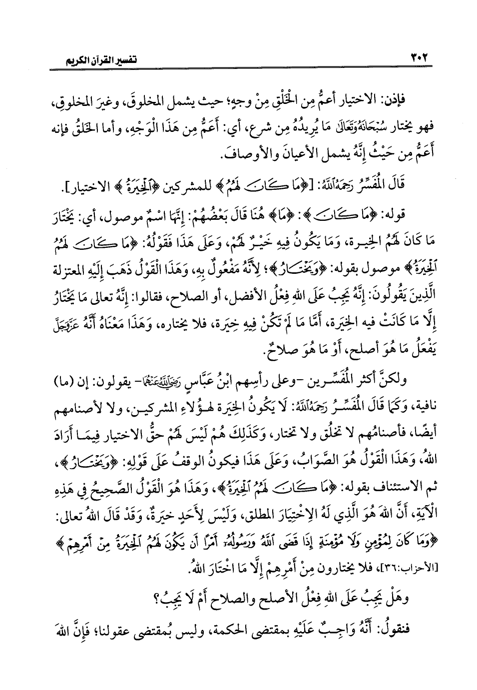 قوله: {مَا كَانَ لَهُمُ}: {مَا} هُنَا قَالَ بَعْضُهُمْ: إِنَّهَا اسْمٌ موصول، أي: يَخْتَارَ مَا كَانَ لَهُمُ الخِيرة، وَمَا يَكُونُ فِيهِ خَيْرٌ لهمْ، وَعَلَى هَذَا فَقَوْلُهُ: {مَا كَانَ لَهُمُ الْخِيَرَةُ} موصول بقوله: {وَيَخْتَارُ}؛ لِأَنَّهُ مَفْعُولٌ بِهِ، وَهَذَا الْقَوْلُ ذَهَبَ إِلَيْهِ المعتزلة الَّذِينَ يَقُولُونَ: إِنَّهُ يَجِبُ عَلَى اللَّهِ فِعْلُ الأفضل، أو الصلاح، فقالوا: إِنَّهُ تعالى مَا يَخْتَارُ إِلَّا مَا كَانَتْ فيه الخِيَرة، أَمَّا مَا لَمْ تَكُنْ فِيهِ خِيَرة، فلا يختاره، وَهَذَا مَعْنَا أَنَّهُ عَزَّ وَجَلَّ يَفْعَلُ مَا هُوَ أصلح، أَوْ مَا هُوَ صلاحٌ.