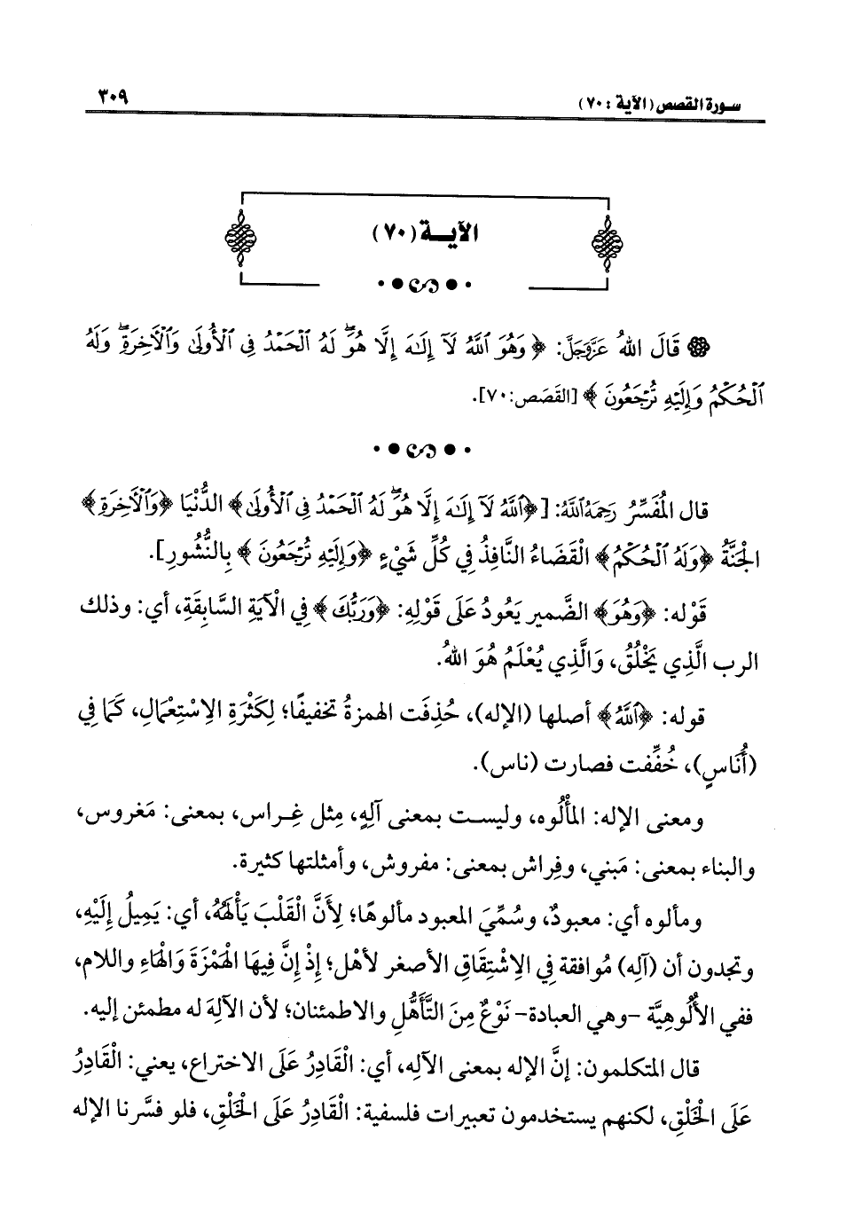 * قَالَ اللَّهُ عَزَّ وَجَلَّ: {وَهُوَ اللَّهُ لَا إِلَهَ إِلَّا هُوَ لَهُ الْحَمْدُ فِي الْأُولَى وَالْآخِرَةِ وَلَهُ الْحُكْمُ وَإِلَيْهِ تُرْجَعُونَ} [القصص: ٧٠].