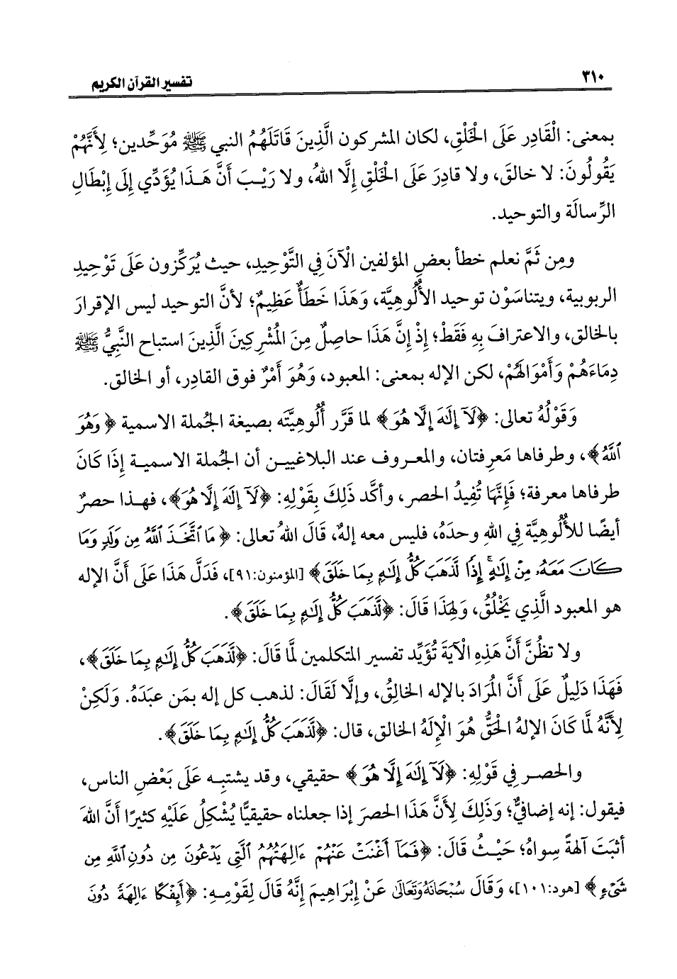 ومن ثَمَّ نعلم خطأ بعضِ المؤلفين الآنَ فِي التَّوْحِيدِ، حيث يُرَكِّزون عَلَى تَوْحِيدِ الربوبية، ويتناسَوْن توحيد الأُلُوهِيَّة، وَهَذَا خَطَأٌ عَظِيمٌ؛ لأنَّ التوحيد ليس الإقرارَ بالخالق، والاعترافَ بِهِ فَقَطْ؛ إِذْ إِنَّ هَذَا حاصِلٌ مِنَ المشرِكِينَ الَّذِينَ استباح النَّبِيُّ -صلى اللَّه عليه وسلم- دِمَاءَهُمْ وَأَمْوَالَهُمْ، لكن الإله بمعنى: المعبود، وَهُوَ أَمْرٌ فوق القادِر، أو الخالق.