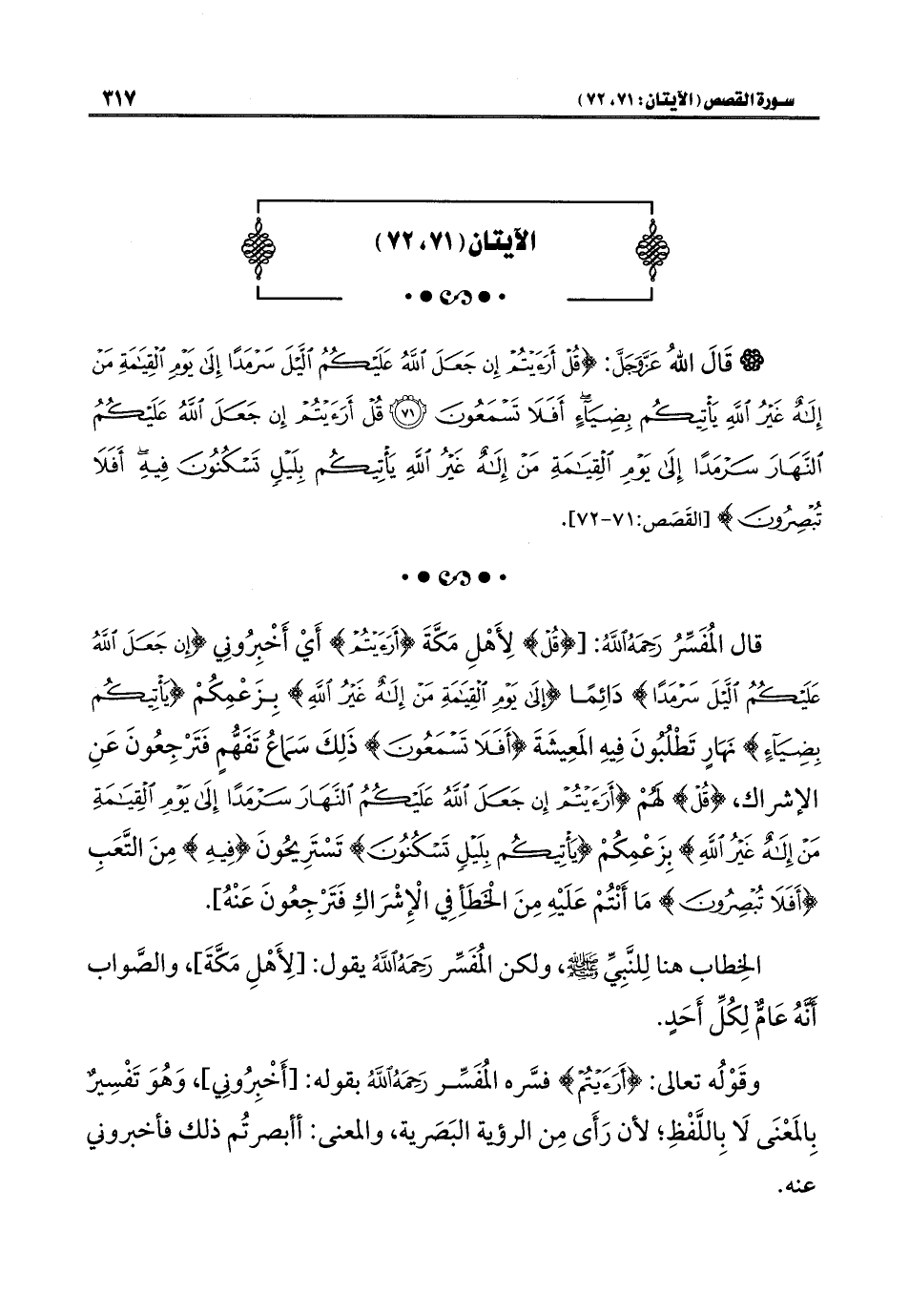 قال المُفَسِّرُ رَحِمَهُ اللَّهُ: [{قُلْ} لِأَهْلِ مَكَّةَ {أَرَأَيْتُمْ} أَيْ أَخْبِرُونِي {إِنْ جَعَلَ اللَّهُ عَلَيْكُمُ اللَّيْلَ سَرْمَدًا} دَائِمًا {إِلَى يَوْمِ الْقِيَامَةِ مَنْ إِلَهٌ غَيْرُ اللَّهِ} بِزَعْمِكُمْ {يَأْتِيكُمْ بِضِيَاءٍ} نَهَارٍ تَطْلبُونَ فِيهِ المَعِيشَةَ {أَفَلَا تَسْمَعُونَ} ذَلِكَ سَمَاعُ تَفَهُّمٍ فَتَرْجِعُونَ عَنِ الإشراك، {قُلْ} لَهُمْ {أَرَأَيْتُمْ إِنْ جَعَلَ اللَّهُ عَلَيْكُمُ النَّهَارَ سَرْمَدًا إِلَى يَوْمِ الْقِيَامَةِ مَنْ إِلَهٌ غَيْرُ اللَّهِ} بِزَعْمِكُمْ {يَأْتِيكُمْ بِلَيْلٍ تَسْكُنُونَ} تَسْتَرِيحُونَ {فِيهِ} هو مِنَ التَّعَبِ {أَفَلَا تُبْصِرُونَ} مَا أَنْتُمْ عَلَيْهِ مِنَ الْخَطَأِ فِي الْإِشْرَاكِ فَتَرْجِعُونَ عَنْهُ].