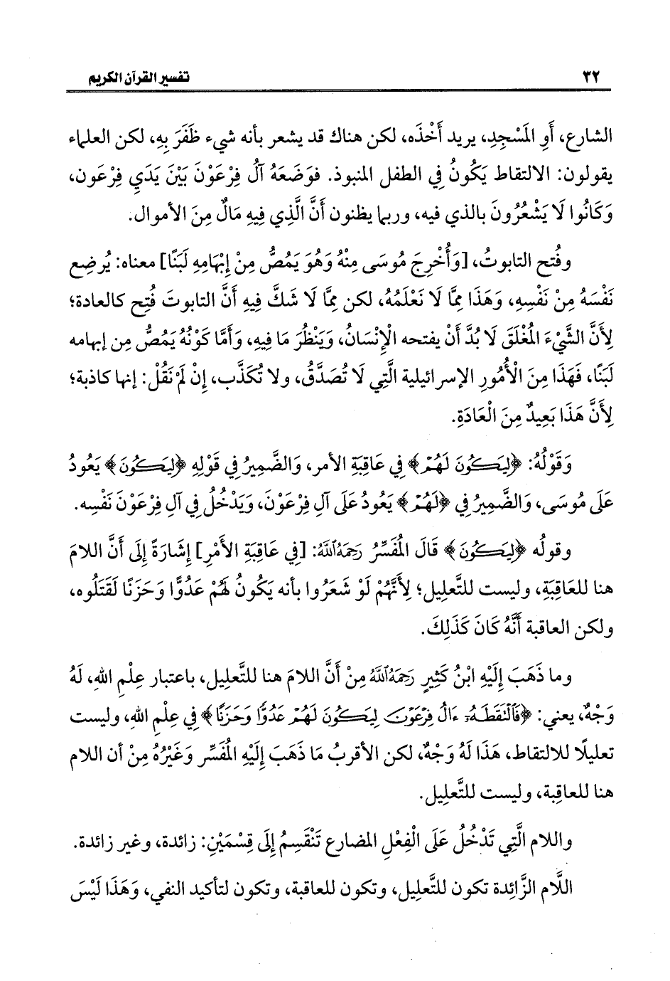 وما ذَهَبَ إِلَيْهِ ابْنُ كَثِيرٍ رَحِمَهُ اللَّهُ مِنْ أَنَّ اللامَ هنا للتَّعلِيل، باعتبار عِلْمِ اللَّهِ، لَهُ وَجْهٌ، يعني: {فَالْتَقَطَهُ آلُ فِرْعَوْنَ لِيَكُونَ لَهُمْ عَدُوًّا وَحَزَنًا} فِي عِلْمِ اللَّهِ، وليست تعليلًا للالتقاط، هَذَا لَهُ وَجْهٌ، لكن الأقربُ مَا ذَهَبَ إِلَيْهِ المُفَسِّر وَغَيْرُهُ مِنْ أن اللام هنا للعاقِبة، وليست للتَّعلِيل.