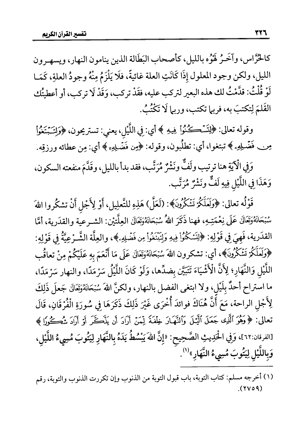 قَوْلُه تعالى: {وَلَعَلَّكُمْ تَشْكُرُونَ}: (لَعَلَّ) هَذِهِ للتَّعلِيل، أَوْ لِأَجْلِ أَنْ تشكُروا اللَّهَ سُبْحَانَهُ وَتَعَالَى عَلَى نِعْمَتِهِ، فهنا ذَكَرَ اللَّهُ سُبْحَانَهُ وَتَعَالَى العِلَّتيْن: الشرعية والقدَرية، أمَّا القدَرية، فَهِيَ فِي قَوْلِهِ: {لِتَسْكُنُوا فِيهِ وَلِتَبْتَغُوا مِنْ فَضْلِهِ}، والعِلَّة الشَّرْعِيَّةُ فِي قَوْلِهِ: {وَلَعَلَّكُمْ تَشْكُرُونَ}، أي: تشكرون اللَّهَ سُبْحَانَهُ وَتَعَالَى عَلَى مَا أَنْعَمَ بِهِ عَلَيْكُمْ مِنْ تعاقُب اللَّيْلِ وَالنَّهَارِ؛ لِأَنَّ الْأَشْيَاءَ تَتبَيَّن بِضدِّها، وَلَوْ كَانَ اللَّيْلُ سَرْمَدًا، والنهار سَرْمَدًا، ما استراح أحدٌ بِلَيْلٍ، ولا ابتغى الفضل بالنهار، ولكنَّ اللَّهَ سُبْحَانَهُ وَتَعَالَى جَعلَ ذَلِكَ لِأَجْلِ الراحة، مَعَ أَنَّ هُنَاكَ فوائدَ أُخْرَى غَيْرَ ذَلِكَ ذَكَرَهَا فِي سُورَةِ الْفُرْقَانِ، قَالَ تعالى: {وَهُوَ الَّذِي جَعَلَ اللَّيْلَ وَالنَّهَارَ خِلْفَةً لِمَنْ أَرَادَ أَنْ يَذَّكَّرَ أَوْ أَرَادَ شُكُورًا} [الفرقان: ٦٢]، وَفِي الحَدِيثِ الصَّحِيح: "إِنَّ اللَّهَ يَبْسُطُ يَدَهُ بالنَّهَارِ لِيَتُوبَ مُسِيءُ اللَّيْلِ، وَبِاللَّيْلِ لِيَتُوبَ مُسِيءُ النَّهَارِ" (¬١).