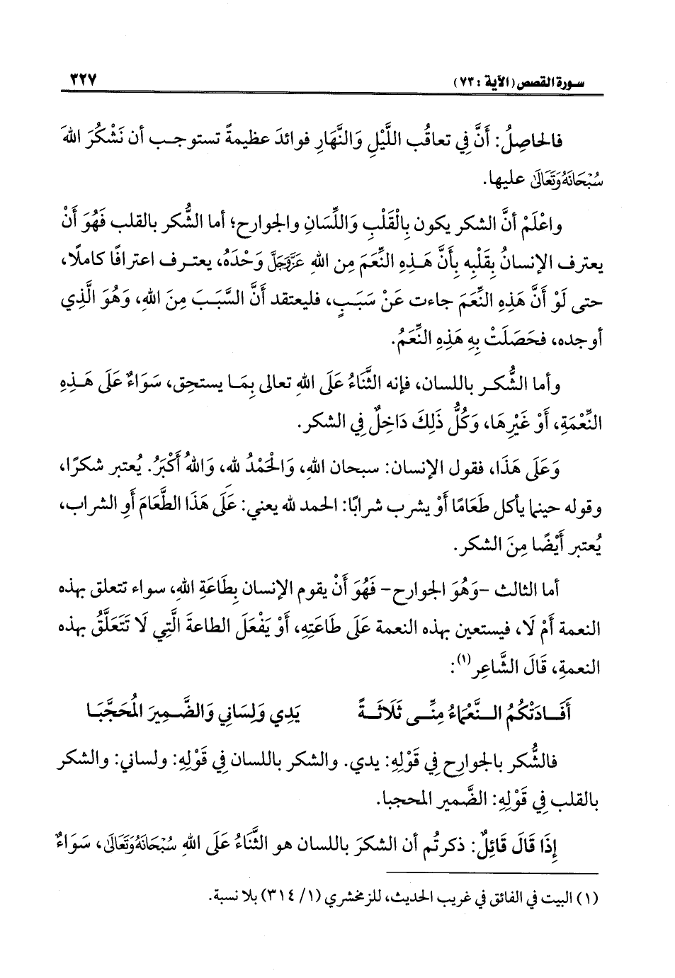 فالشُّكر بالجوارح فِي قَوْلِهِ: يدي. والشكر باللسان فِي قَوْلِهِ: ولساني: والشكر بالقلب فِي قَوْلِهِ: الضَّمير المحجبا.