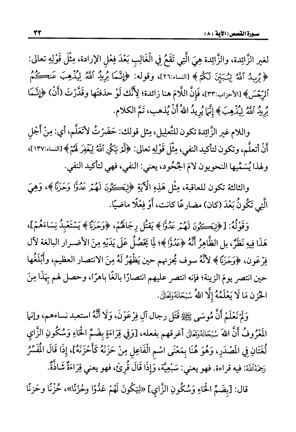 وَلَمْ نَعْلَمْ أَنَّ مُوسَى -صلى اللَّه عليه وسلم- قَتل رجال آلِ فِرْعَوْنَ، وَلَا أَنَّهُ استعبد نساءهم، وإنَّما المَعْرُوفُ أَنَّ اللَّهَ سُبْحَانَهُ وَتَعَالَى أغرقهم بفعله، [وَفِي قِرَاءَةٍ بِضَمِّ الحَاءِ وَسُكُونِ الزَّاي لُغَتَانِ فِي المَصْدَرِ، وَهُوَ هُنَا بِمَعْنَى اسْمِ الْفَاعِلِ مِنْ حَزَنَهُ كَأَحْزَنَهُ]، إِذَا قَالَ المُفَسِّرُ رَحِمَهُ اللَّهُ: فيه قراءة. فهو يعني: سَبْعِيَّة، وَإِذَا قَالَ قُرِئَ، فهو يعني قِرَاءَةٌ شَاذَّةٌ.