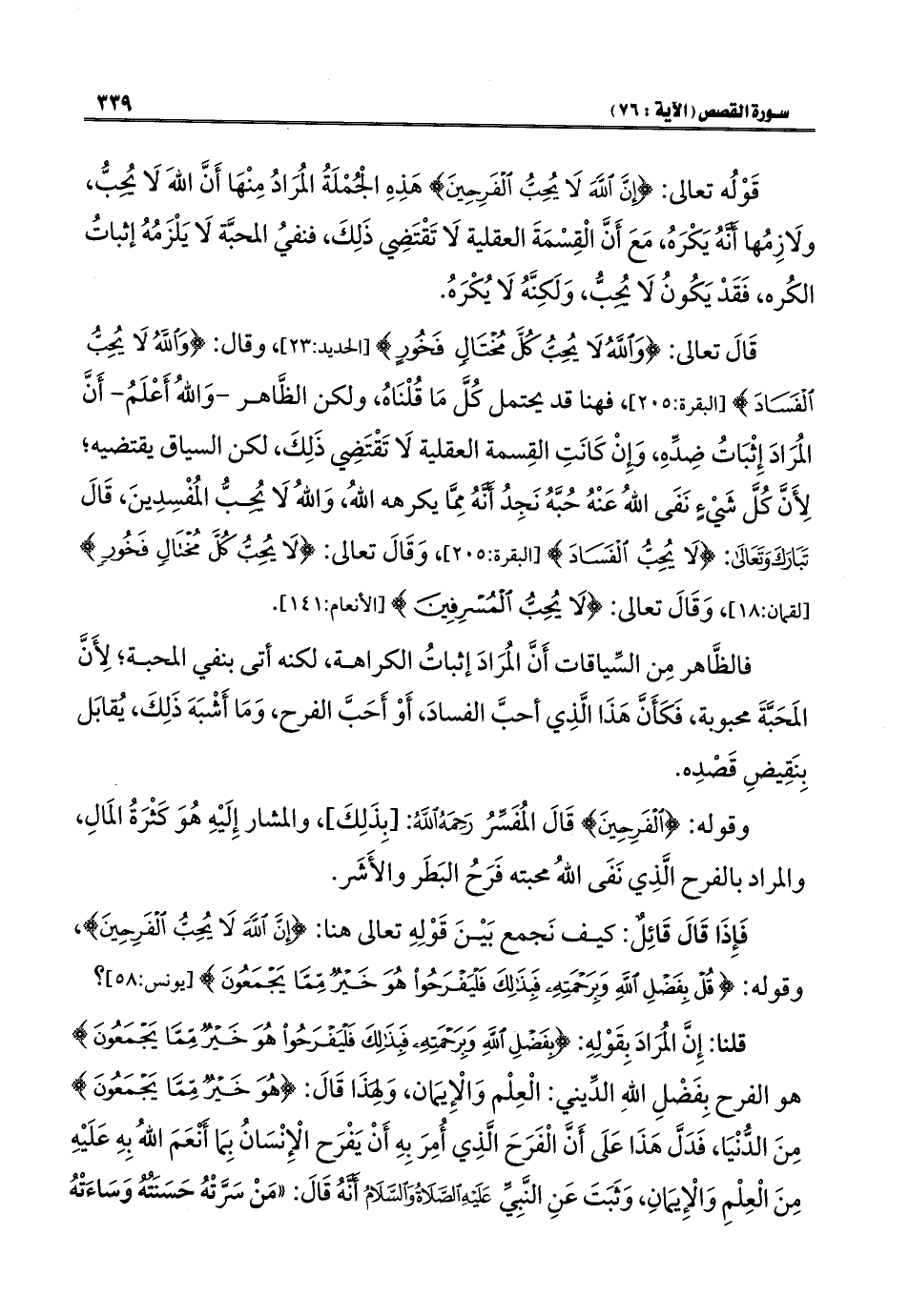 قَوْلُه تعالى: {إِنَّ اللَّهَ لَا يُحِبُّ الْفَرِحِينَ} هَذِهِ الجمْلَةُ المُرَادُ مِنْهَا أَنَّ اللَّهَ لَا يُحِبُّ، ولَازِمُها أَنَّهُ يَكْرَهُ، مَعَ أَنَّ الْقِسْمَةَ العقلية لَا تَقْتَضِي ذَلِكَ، فنفيُ المحبَّة لَا يَلْزَمُهُ إثباتُ الكُره، فَقَدْ يَكُونُ لَا يُحِبُّ، وَلَكِنَّهُ لَا يُكْرَهُ.