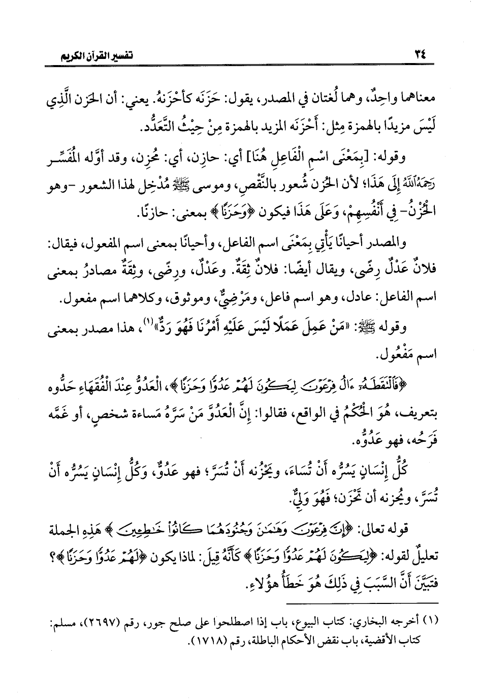 وقوله: [بِمَعْنَى اسْمِ الْفَاعِلِ هُنَا] أي: حازِن، أي: مُحزِن، وقد أوَّله المُفَسِّر رَحِمَهُ اللَّهُ إِلَى هَذَا؛ لأن الحُزن شُعور بالنَّقْصِ، وموسى -صلى اللَّه عليه وسلم- مُدْخِل لهذا الشعور -وهو الحُزْنُ- فِي أنفُسِهِمْ، وَعَلَى هَذَا فيكون {وَحَزَنًا} بمعنى: حازنًا.