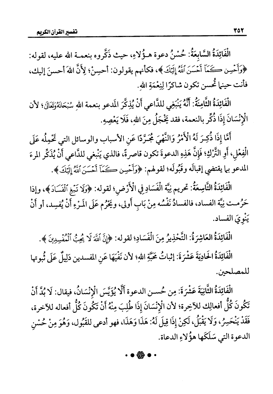 الْفَائِدَةُ الحَادِيَةَ عَشْرَةَ: إثباتُ محَبَّةِ اللَّهِ؛ لأن نَفْيَهَا عَنِ المفسدين دَلِيل عَلَى ثُبوتها للمصلحين.