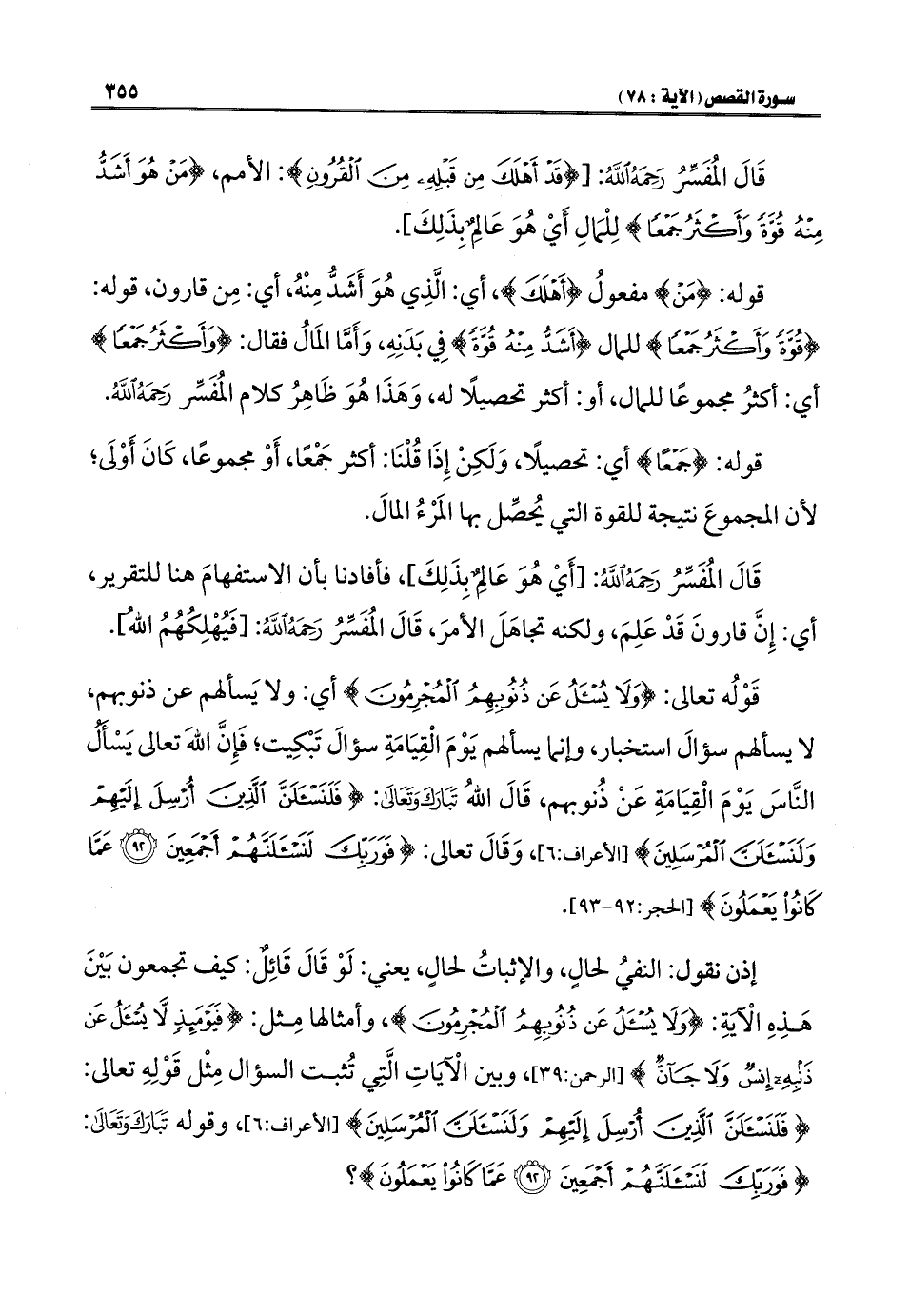قَوْلُه تعالى: {وَلَا يُسْأَلُ عَنْ ذُنُوبِهِمُ الْمُجْرِمُونَ} أي: ولا يَسألهم عن ذنوبهم، لا يسألهم سؤالَ استخبار، وإنما يسألهم يَوْمَ الْقِيَامَةِ سؤالَ تَبْكيت، فَإِنَّ اللَّهَ تعالى يَسْأَلُ النَّاسَ يَوْمَ الْقِيَامَةِ عَنْ ذُنوبهم، قَالَ اللَّهُ تَبَارَكَ وَتَعَالَى: {فَلَنَسْأَلَنَّ الَّذِينَ أُرْسِلَ إِلَيْهِمْ وَلَنَسْأَلَنَّ الْمُرْسَلِينَ} [الأعراف: ٦]، وَقَالَ تعالى: {فَوَرَبِّكَ لَنَسْأَلَنَّهُمْ أَجْمَعِينَ (٩٢) عَمَّا كَانُوا يَعْمَلُونَ} [الحجر: ٩٢ - ٩٣].