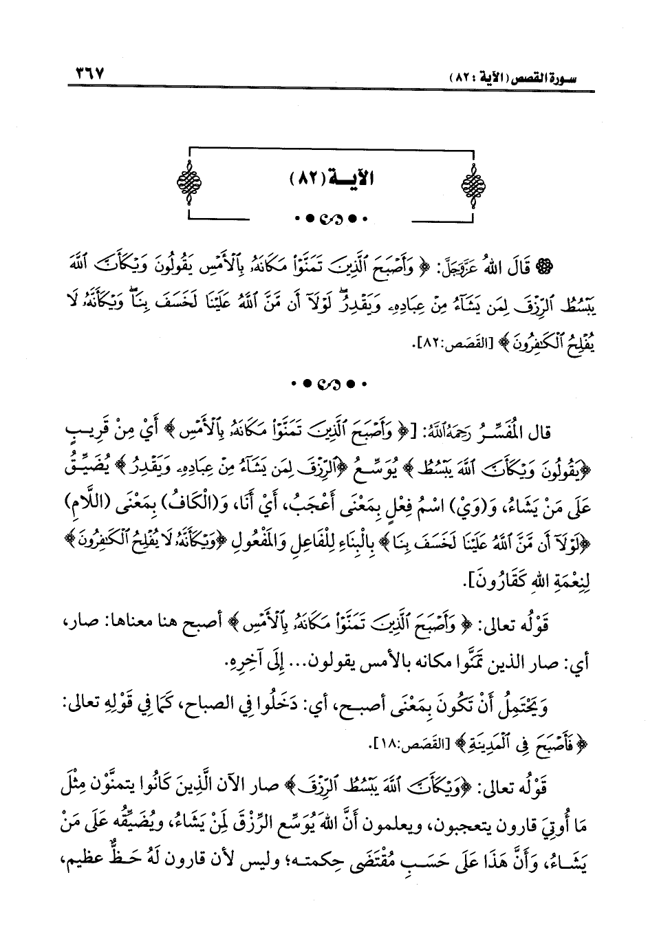 قال المُفَسِّرُ رَحِمَهُ اللَّهُ: [{وَأَصْبَحَ الَّذِينَ تَمَنَّوْا مَكَانَهُ بِالْأَمْسِ} أَيْ مِنْ قَرِيبٍ {يَقُولُونَ وَيْكَأَنَّ اللَّهَ يَبْسُطُ} يُوَسِّعُ {الرِّزْقَ لِمَنْ يَشَاءُ مِنْ عِبَادِهِ وَيَقْدِرُ} يُضَيِّقُ عَلَى مَنْ يَشَاءُ، وَ (وَيْ) اسْمُ فِعْلٍ بِمَعْنَى أَعْجَبُ، أَيْ أَنَا، وَ (الْكَافُ) بِمَعْنَى (اللَّامِ) {لَوْلَا أَنْ مَنَّ اللَّهُ عَلَيْنَا لَخَسَفَ بِنَا} بِالْبِنَاءِ لِلْفَاعِلِ وَالمَفْعُولِ {وَيْكَأَنَّهُ لَا يُفْلِحُ الْكَافِرُونَ} لِنِعْمَةِ اللَّهِ كَقَارُونَ].
