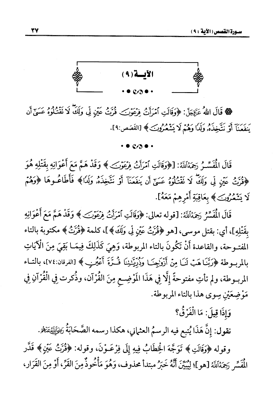 قَالَ المُفَسِّرُ رَحِمَهُ اللَّهُ: [قوله تعالى: {وَقَالَتِ امْرَأَتُ فِرْعَوْنَ} وَقَدْ هَمَّ مَعَ أَعْوَانِهِ بِقَتْلِهِ، أي: بقتل موسى، [هو {قُرَّتُ عَيْنٍ لِي وَلَكَ}]، كلمة {قُرَّتُ} مكتوبة بالتاء المفتوحة، والقاعدة أَنْ تَكُونَ بالتاء المربوطة، وَهِيَ كَذَلِكَ فِيمَا بَقِيَ مِنَ الآيَاتِ بالمربوطة {رَبَّنَا هَبْ لَنَا مِنْ أَزْوَاجِنَا وَذُرِّيَّاتِنَا قُرَّةَ أَعْيُنٍ} [الفرقان: ٧٤]، بالتاء المربوطة، ولم تأتِ مفتوحةً إِلَّا فِي هَذَا المَوْضِعِ مِنَ القُرْآن، وذُكرت فِي الْقُرْآنِ فِي مَوْضِعَيْنِ سِوى هذا بالتاء المربوطة.