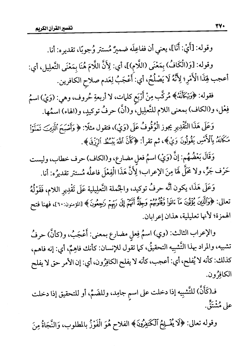 والإعراب الثالث: (وي) اسمُ فِعلٍ مضارع بمعنى: أَعْجَبُ، و (كأنَّ) حرفُ تشبيه، والمراد بهذا التَّشبِيه التحقيقُ، كما تقول للإنسان: كأنك فاهِمٌ، أي: إنه فاهم، كذلك: كأنه لا يُفلح، أي: أعجب، كأنه لا يفلح الكافِرُون، أي: إن الأمر حق لا يفلح الكافِرُون.
