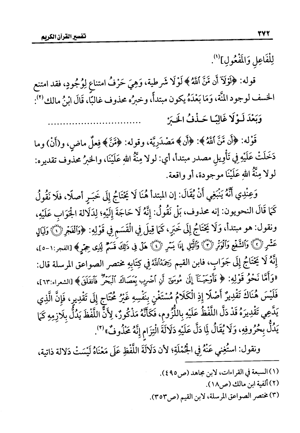 وَعِنْدِي أَنَّهُ يَنْبَغِي أَنْ يُقَالَ: إن المبتدأ هُنَا لَا يَحْتَاجُ إِلَى خَبَرٍ أصلًا، فلَا نَقُولُ كَمَا قَالَ النحويون: إنه محذوف، بَلْ نَقُولُ: إِنَّهُ لَا حَاجَةَ إِلَيْهِ؛ لِدَلَالة الْجَوَابِ عَلَيْهِ، ونقول: هو مبتدأ، وَلَا يَحْتَاجُ إِلَى خَبَرٍ، كَمَا قِيلَ فِي الْقَسَمِ فِي قَوْلِهِ: {وَالْفَجْرِ (١) وَلَيَالٍ عَشْرٍ (٢) وَالشَّفْعِ وَالْوَتْرِ (٣) وَاللَّيْلِ إِذَا يَسْرِ (٤) هَلْ فِي ذَلِكَ قَسَمٌ لِذِي حِجْرٍ} [الفجر: ١ - ٥]، إِنَّهُ لَا يَحْتَاجُ إِلَى جَوَابٍ، فابن القيم رَحِمَهُ اللَّهُ فِي كِتَابِهِ مختصر الصواعق المرسلة قال: "وَأَمَّا نَحْوُ قَوْلِهِ: {فَأَوْحَيْنَا إِلَى مُوسَى أَنِ اضْرِبْ بِعَصَاكَ الْبَحْرَ فَانْفَلَقَ} [الشعراء: ٦٣]، فَلَيْسَ هُنَاكَ تَقْدِيرٌ أَصْلًا إِذِ الْكَلَامُ مُسْتَغْنٍ بنَفْسِهِ غَيْرُ مُحْتَاجٍ إِلَى تَقْدِيرٍ، فَإِنَّ الَّذِي يَدَّعِي تَقْدِيرَهُ قَدْ دَلَّ اللَّفْظُ عَلَيْهِ بِاللُّزُومِ، فَكَأَنَّهُ مَذْكُورٌ؛ لِأَنَّ اللَّفْظَ يَدُلُّ بلَازِمِهِ كَمَا يَدُلُّ بِحُرُوفِهِ، وَلَا يُقَالُ لمَا دَلَّ عَلَيْهِ دَلَالَةَ الْتِزَامٍ إِنَّهُ مَحْذُوفٌ" (¬٣).
