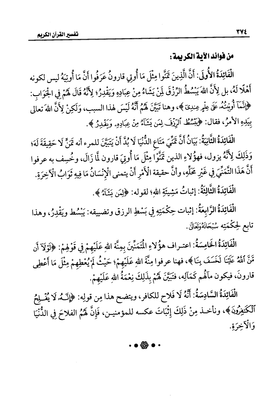الْفَائِدَةُ الأُولَى: أَنَّ الَّذِينَ تَمَنَّوا مِثْلَ مَا أُوتِي قارونُ عَرَفُوا أَنَّ مَا أُوتيَهُ ليس لكونه أَهْلًا لَهُ، بل لِأَنَّ اللَّهَ يَبْسُطُ الرِّزْقَ لمِنْ يَشَاءُ مِنْ عِبَادِهِ ويَقْدِرُ؛ لِأَنَّهُ قَالَ لَهُمْ فِي الجَوَابِ: {إِنَّمَا أُوتِيتُهُ عَلَى عِلْمٍ عِنْدِي}، وهنا تَبَيَّنَ لَهُمُ أَنَّهُ لَيْسَ لهذا السبب، وَلَكِنْ لِأَنَّ اللَّهَ تعالى بِيَد الأمرُ، فقال: {يَبْسُطُ الرِّزْقَ لِمَنْ يَشَاءُ مِنْ عِبَادِهِ وَيَقْدِرُ}.