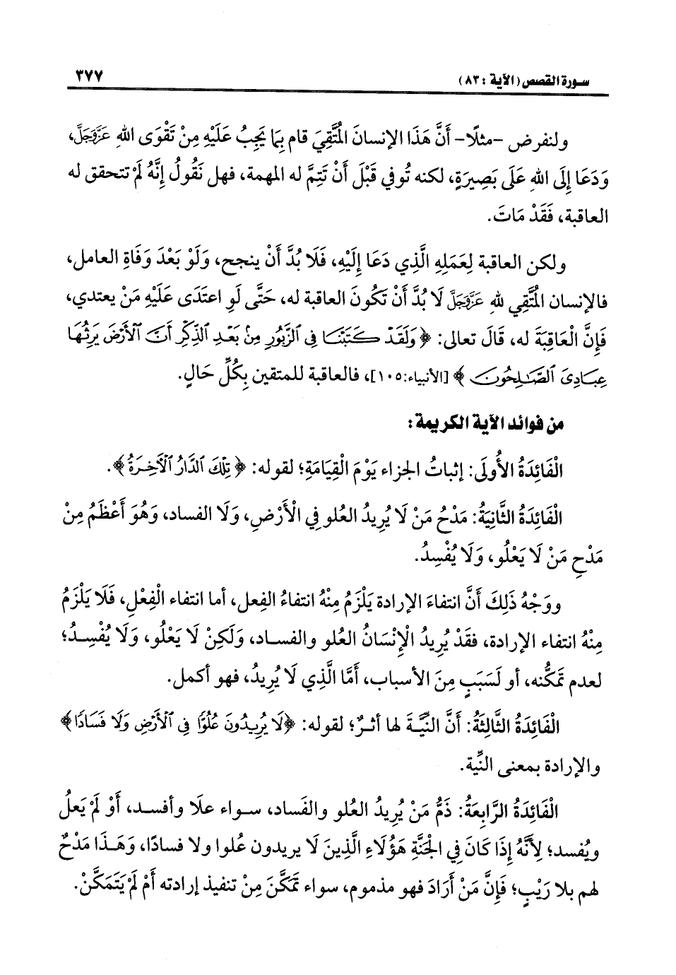الْفَائِدَةُ الثَّانِيَةُ: مَدْحُ مَنْ لَا يُرِيدُ العُلو فِي الْأَرْضِ، وَلَا الفساد، وَهُوَ أَعْظَمُ مِنْ مَدْحِ مَنْ لَا يَعْلُو، وَلَا يُفْسِدُ.