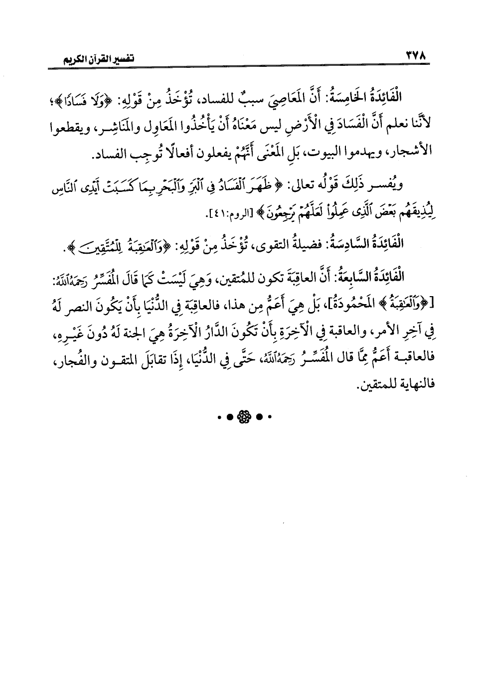 الْفَائِدَةُ السَّابِعَةُ: أَنَّ العاقِبَةَ تكون للمُتقين، وَهِيَ لَيْسَتْ كَمَا قَالَ المُفَسِّرُ رَحِمَهُ اللَّهُ: [{وَالْعَاقِبَةُ} المَحْمُودَةُ]، بَلْ هِيَ أَعَمُّ مِن هذا، فالعاقِبَة فِي الدُّنْيَا بِأَنْ يَكُونَ النصر لَهُ فِي آخِرِ الأمر، والعاقبة فِي الآخِرَةِ بِأَنْ تَكُونَ الدَّارُ الآخِرَةُ هِيَ الجنة لَهُ دُونَ غَيْرِهِ، فالعاقبة أَعَمُّ مِمَّا قال المُفَسِّرُ رَحِمَهُ اللَّهُ، حَتَّى فِي الدُّنْيَا، إِذَا تقابَلَ المتقون والفُجار، فالنهاية للمتقين.