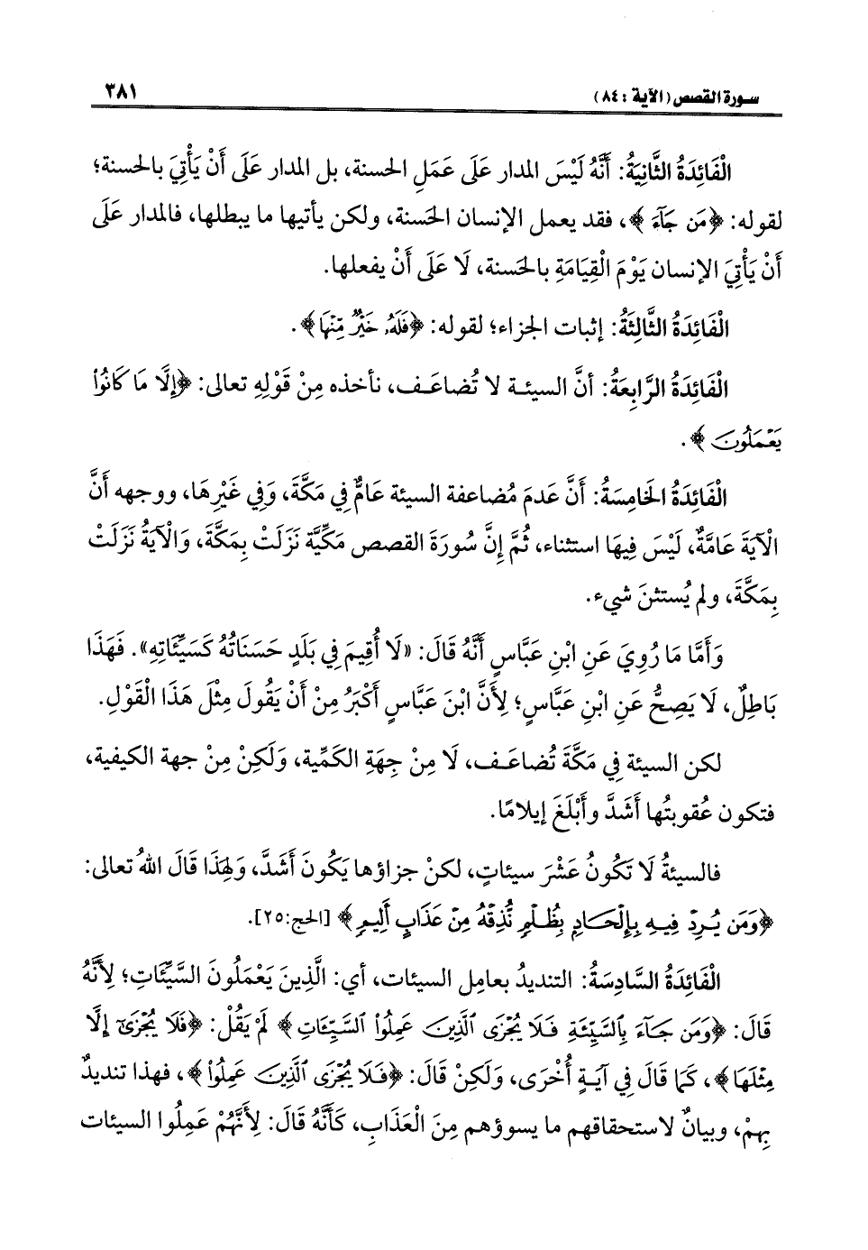 الْفَائِدَةُ الخَامِسَةُ: أَنَّ عَدمَ مُضاعفة السيئة عَامٌّ فِي مَكَّةَ، وَفِي غَيْرِهَا، ووجهه أَنَّ الآيَةَ عَامَّةٌ، لَيْسَ فِيهَا استثناء، ثُمَّ إِنَّ سُورَةَ القصص مَكِّيَّة نَزَلَتْ بِمَكَّةَ، وَالآيَةُ نَزَلَتْ بِمَكَّةَ، ولم يُستثنَ شيء.