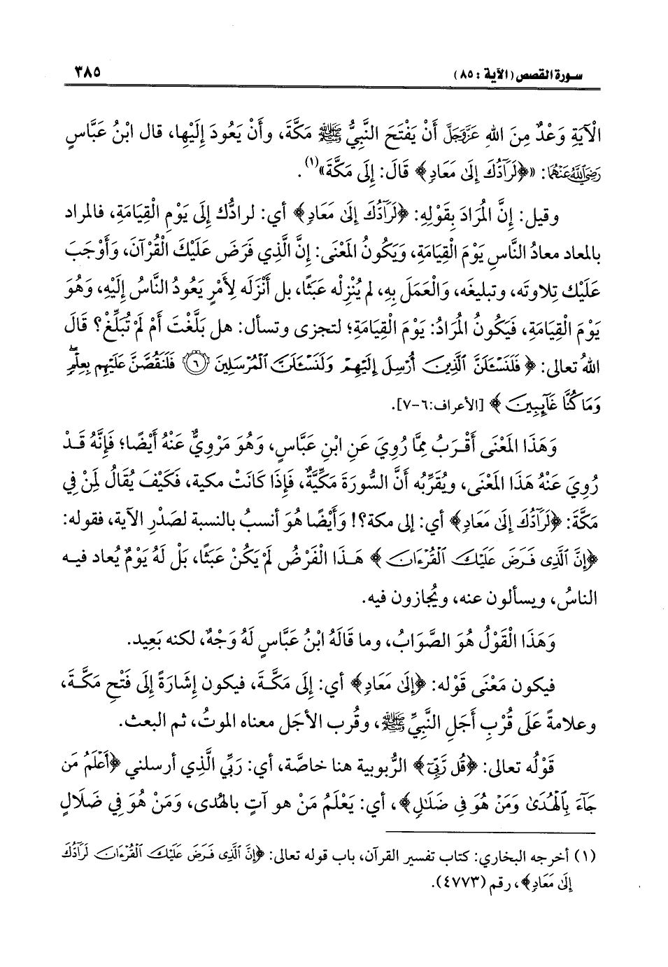 (¬١) أخرجه البخاري: كتاب تفسير القرآن، باب قوله تعالى: {إِنَّ الَّذِي فَرَضَ عَلَيْكَ الْقُرْآنَ لَرَادُّكَ إِلَى مَعَادٍ}، رقم (٤٧٧٣).