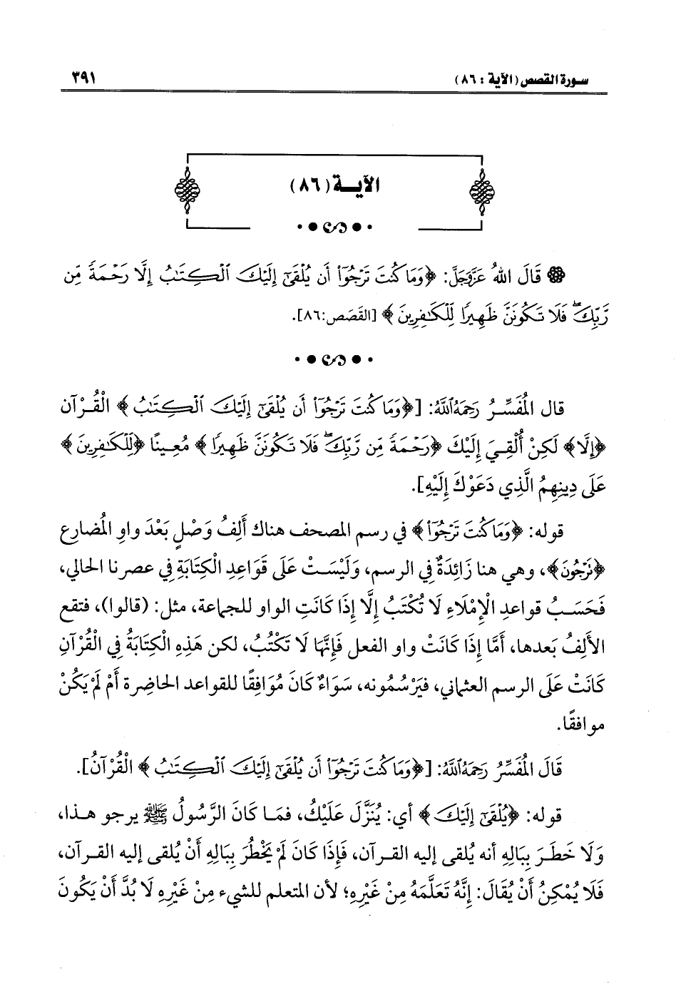 قال المُفَسِّرُ رَحِمَهُ اللَّهُ: [{وَمَا كُنْتَ تَرْجُو أَنْ يُلْقَى إِلَيْكَ الْكِتَابُ} الْقُرْآن {إِلَّا} لَكِنْ ألقِيَ إِلَيْكَ {رَحْمَةً مِنْ رَبِّكَ فَلَا تَكُونَنَّ ظَهِيرًا} مُعِينًا {لِلْكَافِرِينَ} عَلَى دِينِهِمُ الَّذِي دَعَوْكَ إِلَيْهِ].