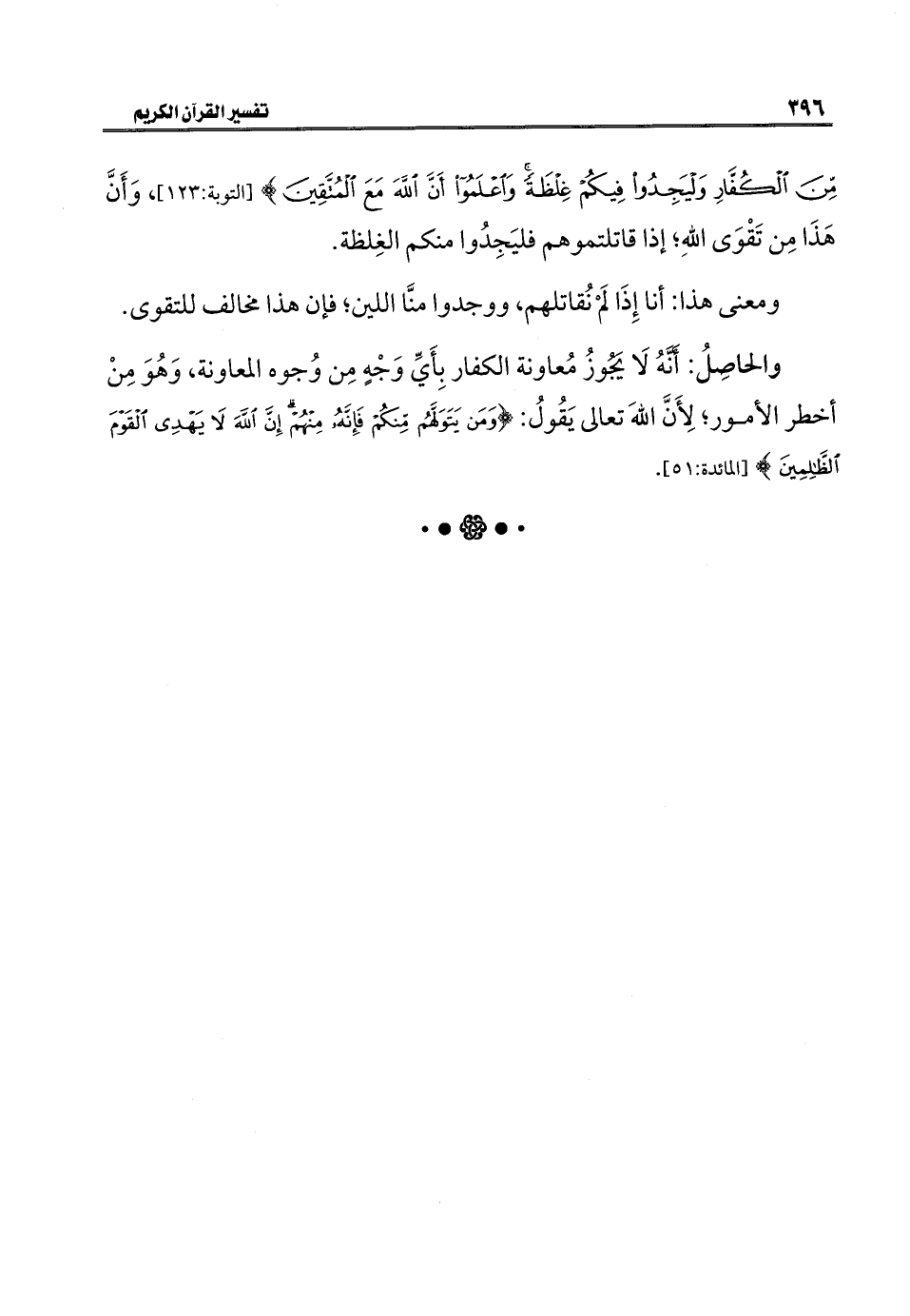 والحاصِلُ: أَنَّهُ لَا يَجُوزُ مُعاونة الكفار بِأَيِّ وَجْهٍ مِن وُجوه المعاونة، وَهُوَ مِنْ أخطر الأمور؛ لِأَنَّ اللَّهَ تعالى يَقُولُ: {وَمَنْ يَتَوَلَّهُمْ مِنْكُمْ فَإِنَّهُ مِنْهُمْ إِنَّ اللَّهَ لَا يَهْدِي الْقَوْمَ الظَّالِمِينَ} [المائدة: ٥١].