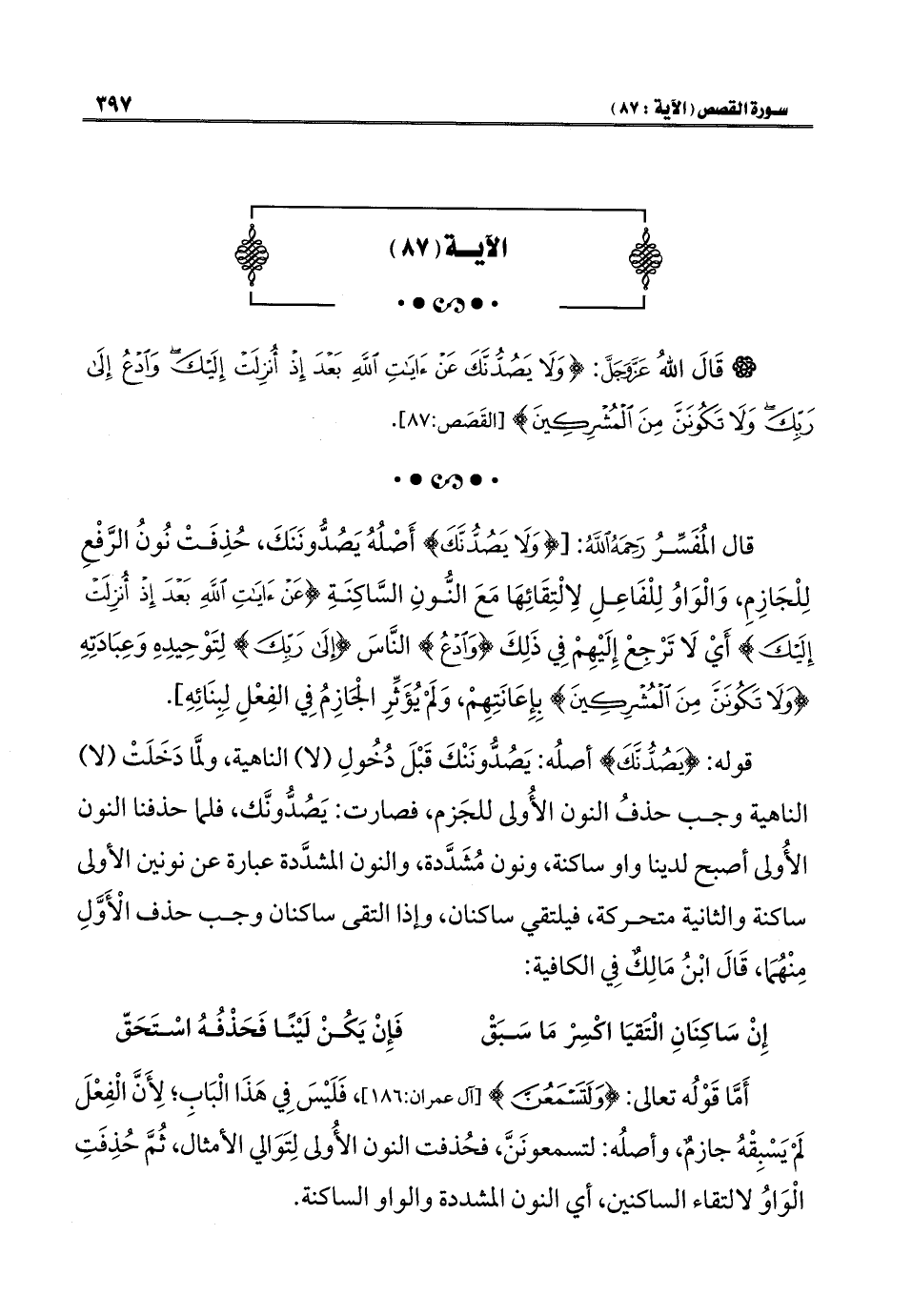 قال المُفَسِّرُ رَحِمَهُ اللَّهُ: [{وَلَا يَصُدُّنَّكَ} أَصْلُهُ يَصُدُّونَنَكَ، حُذِفَتْ نُونُ الرَّفْعِ لِلْجَازِمِ، وَالْوَاوُ لِلْفَاعِلِ لِالْتِقَائِهَا مَعَ النُّونِ السَّاكِنَةِ {عَنْ آيَاتِ اللَّهِ بَعْدَ إِذْ أُنْزِلَتْ إِلَيْكَ} أَيْ لَا تَرْجِعْ إِلَيْهِمْ فِي ذَلِكَ {وَادْعُ} النَّاسَ {إِلَى رَبِّكَ} لِتَوْحِيدِهِ وَعِبَادَتِهِ {وَلَا تَكُونَنَّ مِنَ الْمُشْرِكِينَ} بِإِعَانَتِهِمْ، وَلَمْ يُؤَثِّرِ الْجَازِمُ فِي الفِعْلِ لِبِنَائِهِ].