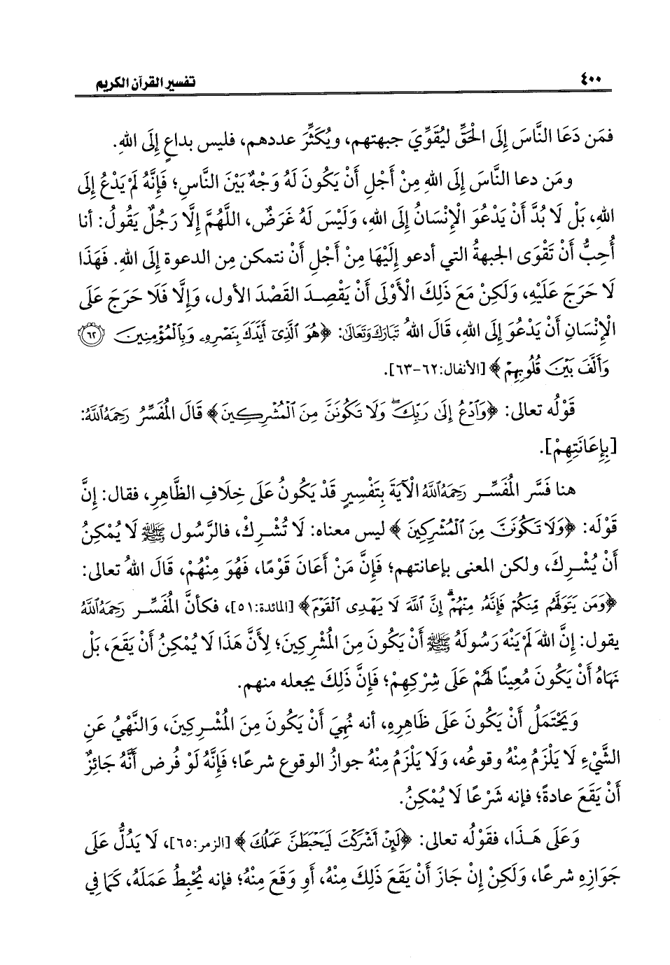 قَوْلُه تعالى: {وَادْعُ إِلَى رَبِّكَ وَلَا تَكُونَنَّ مِنَ الْمُشْرِكِينَ} قَالَ المُفَسِّرُ رَحِمَهُ اللَّهُ: [بِإِعَانَتِهِمْ].