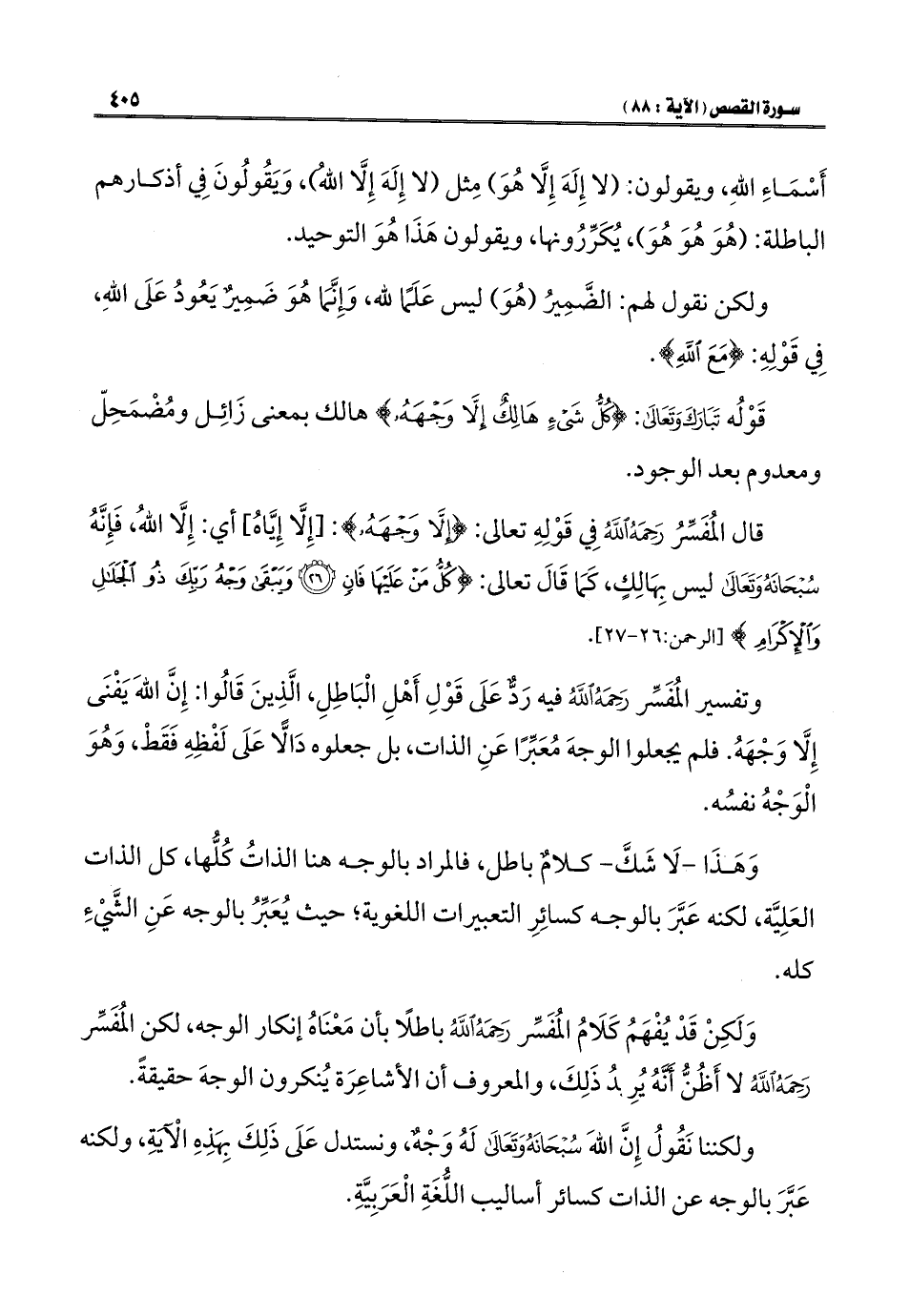 وتفسير المُفَسِّر رَحِمَهُ اللَّهُ فيه رَدٌّ عَلَى قَوْلِ أَهْلِ الْبَاطِلِ، الَّذِينَ قَالُوا: إِنَّ اللَّهَ يَفْنَى إِلَّا وَجْهَهُ. فلم يجعلوا الوجهَ مُعَبِّرًا عَنِ الذات، بل جعلوه دَالًّا عَلَى لَفْظِهِ فَقَطْ، وَهُوَ الْوَجْهُ نفسُه.
