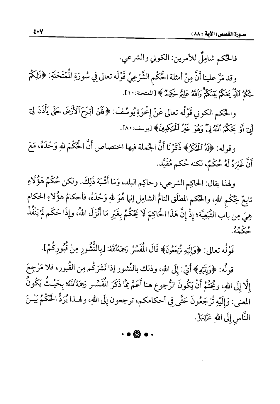 ولهذا يقال: الحاكِم الشرعي، وحاكِم البلد، وَمَا أَشْبَهَ ذَلِكَ. ولكن حُكْمُ هَؤُلَاءِ تابعٌ لِحُكْمِ اللَّهِ، والحُكم المطلَق التامُّ الشامِل إنما هُوَ للَّهِ وَحْدَهُ، فأحكامُ هؤُلاءِ الحكام هِيَ مِن باب التَّبعِيَّة؛ إِذْ إِنَّ هَذَا الحْاكِمَ لَا يَحْكُمُ بِغَيْرِ مَا أَنْزَلَ اللَّهُ، وإِذَا حَكَم لَمْ يَنْفُذْ حُكْمُهُ.