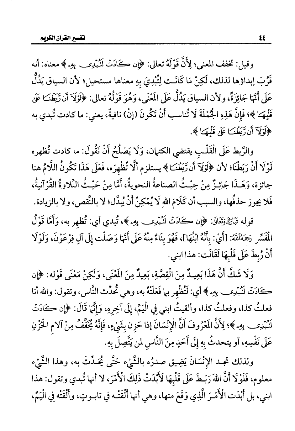 وَلَا شَكَّ أَنَّ هَذَا بَعِيدٌ مِنَ الْقِصَّةِ، بَعِيدٌ مِنَ المَعْنَى، وَلَكِنْ مَعْنَى قَوْله: {إِنْ كَادَتْ لَتُبْدِي بِهِ} أي: لَتُظْهِر بما فَعَلَتْهُ به، وهي تُحدِّث النَّاس، وتقول: واللَّه أنا فعلتُ كذا، وفعلتُ كذا، وألقيتُ ابني فِي الْيَمِّ، إِلَى آخِرِهِ، وَإِنَّمَا قَالَ: {إِنْ كَادَتْ لَتُبْدِي بِهِ}؛ لِأَنَّ المَعْرُوفَ أَنَّ الْإِنْسَانَ إذا حَزِن بِشَيْءٍ، فَإِنَّهُ يُخَفِّفُ مِنْ آلامِ الْحُزْنِ عَلَى نَفْسِهِ، أو يتحدثُ بِهِ إِلَى أَحَدٍ مِنَ النَّاسِ لمن يَتَّصِلَ بِهِ.