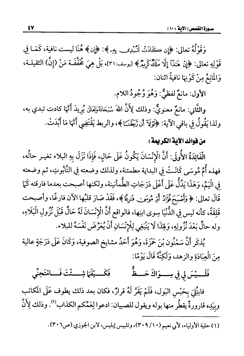 والثَّاني: مانعٌ معنويٌّ: وذلك لِأَنَّ اللَّهَ سُبْحَانَهُ وَتَعَالَى يُرِيدَ أَنَّهَا كادت تبدي به، ولذا يَقُولُ فِي باقي الآية: {لَوْلَا أَنْ رَبَطْنَا}، والربط يَقْتَضِي أَنَّهَا مَا أَبْدَتْ.