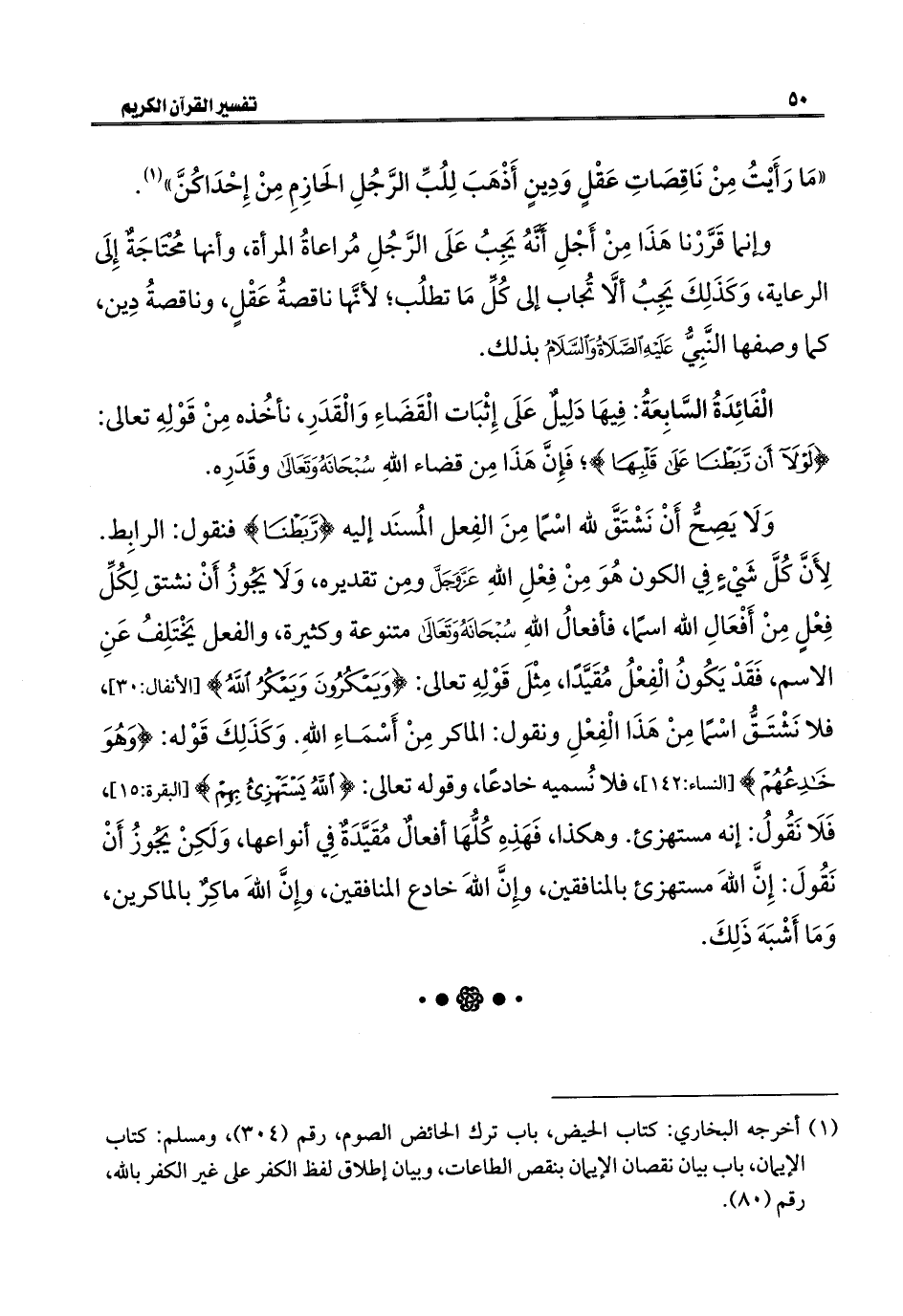 (¬١) أخرجه البخاري: كتاب الحيض، باب ترك الحائض الصوم، رقم (٣٠٤)، ومسلم: كتاب الإيمان، باب بيان نقصان الإيمان بنقص الطاعات، وبيان إطلاق لفظ الكفر على غير الكفر باللَّه، رقم (٨٠).