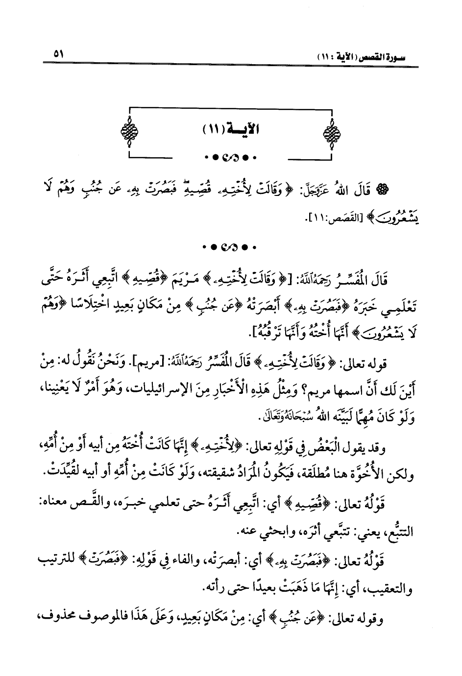 قَالَ المُفَسِّرُ رَحِمَهُ اللَّهُ: [{وَقَالَتْ لِأُخْتِهِ} مَرْيَمَ {قُصِّيهِ} اتَّبِعِي أَثَرَهُ حَتَّى تَعْلَمِي خَبَرَهُ {فَبَصُرَتْ بِهِ} أَبْصَرَتْهُ {عَنْ جُنُبٍ} مِنْ مَكَانٍ بَعِيدٍ اخْتِلَاسًا {وَهُمْ لَا يَشْعُرُونَ} أَنَّهَا أُخْتُهُ وَأَنَّهَا تَرْقُبُهُ].