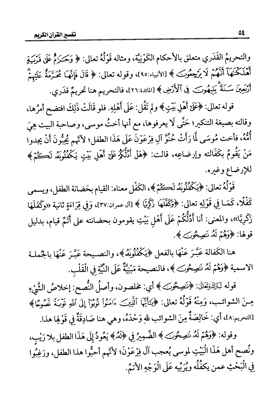 قَوْلُهُ تعالى: {يَكْفُلُونَهُ لَكُمْ}، الكَفْل معناه: القيام بحَضانة الطفل، ويسمى كَفْلًا، كَمَا فِي قَوْلِهِ تعالى: {وَكَفَّلَهَا زَكَرِيَّا} [آل عمران: ٣٧]، وِفي قِرَاءَةٍ ثانية "وكَفَلَهَا زَكَرِيَّا"، والمعنى: أنا أَدُلُّكُمْ عَلَى أَهْلِ بَيْتِ يقومون بحضانته على أَتَمِّ قيام، بدليل قولها: {وَهُمْ لَهُ نَاصِحُونَ}.