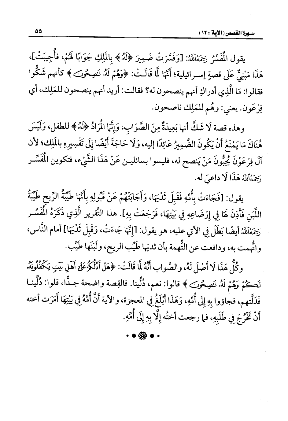 وهذه قصة لَا شَكَّ أنها بَعِيدَةٌ مِنَ الصَّوَابِ، وَإِنَّمَا المُرَادُ {لَهُ} للطفل، وَلَيْسَ هُنَاكَ مَا يَمْنَعُ أَنْ يَكُونَ الضَّمِيرُ عَائِدًا إليه، وَلَا حَاجَةَ أَيْضًا إِلَى تَفْسِير بالمَلِك؛ لأن آلَ فِرْعَوْنَ يُحِبُّونَ مَنْ يَنصح له، فليسوا بسائلين عَنْ هَذَا الشَّيْء، فتكوين المُفَسِّر رَحِمَهُ اللَّهُ هَذَا لَا داعيَ له.