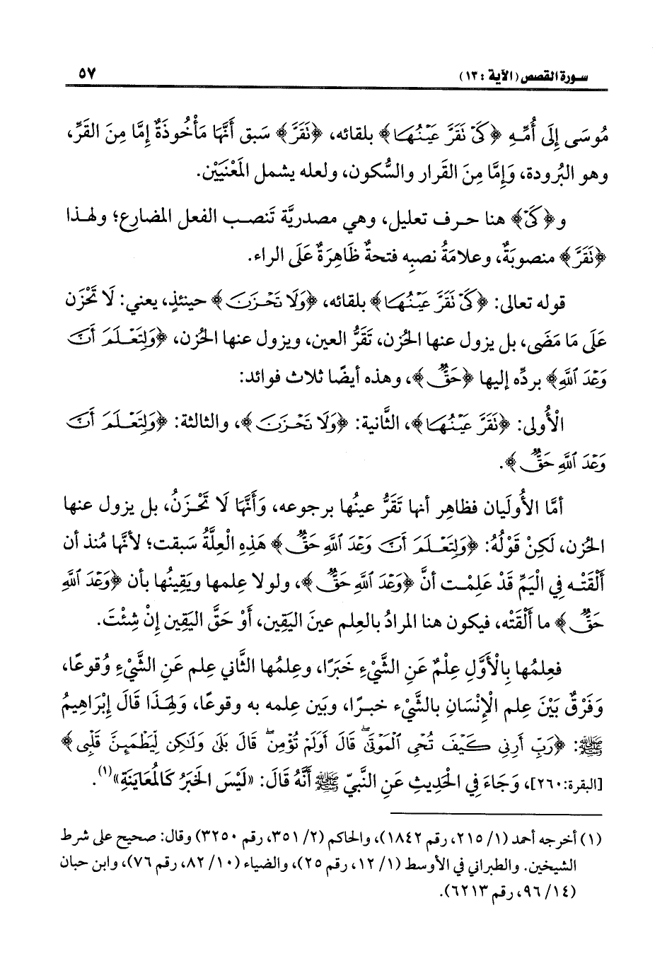 أمَّا الأُولَيان فظاهِر أنها تَقَرُّ عينُها برجوعه، وَأَنَّهَا لَا تَحْزَنُ، بل يزول عنها الحُزن، لَكِنْ قَوْلُهُ: {وَلِتَعْلَمَ أَنَّ وَعْدَ اللَّهِ حَقٌّ} هَذِهِ الْعِلَّةُ سَبقت؛ لأنَّها مُنذ أن ألقَتْه فِي الْيَمِّ قَدْ عَلِمْت أنَّ {وَعْدَ اللَّهِ حَقٌّ}، ولولا عِلمها ويَقِينُها بأن {وَعْدَ اللَّهِ حَقٌّ} ما ألقَتْه، فيكون هنا المرادُ بالعِلم عينَ اليَقِين، أَوْ حَقَّ اليَقِين إِنْ شِئْتَ.