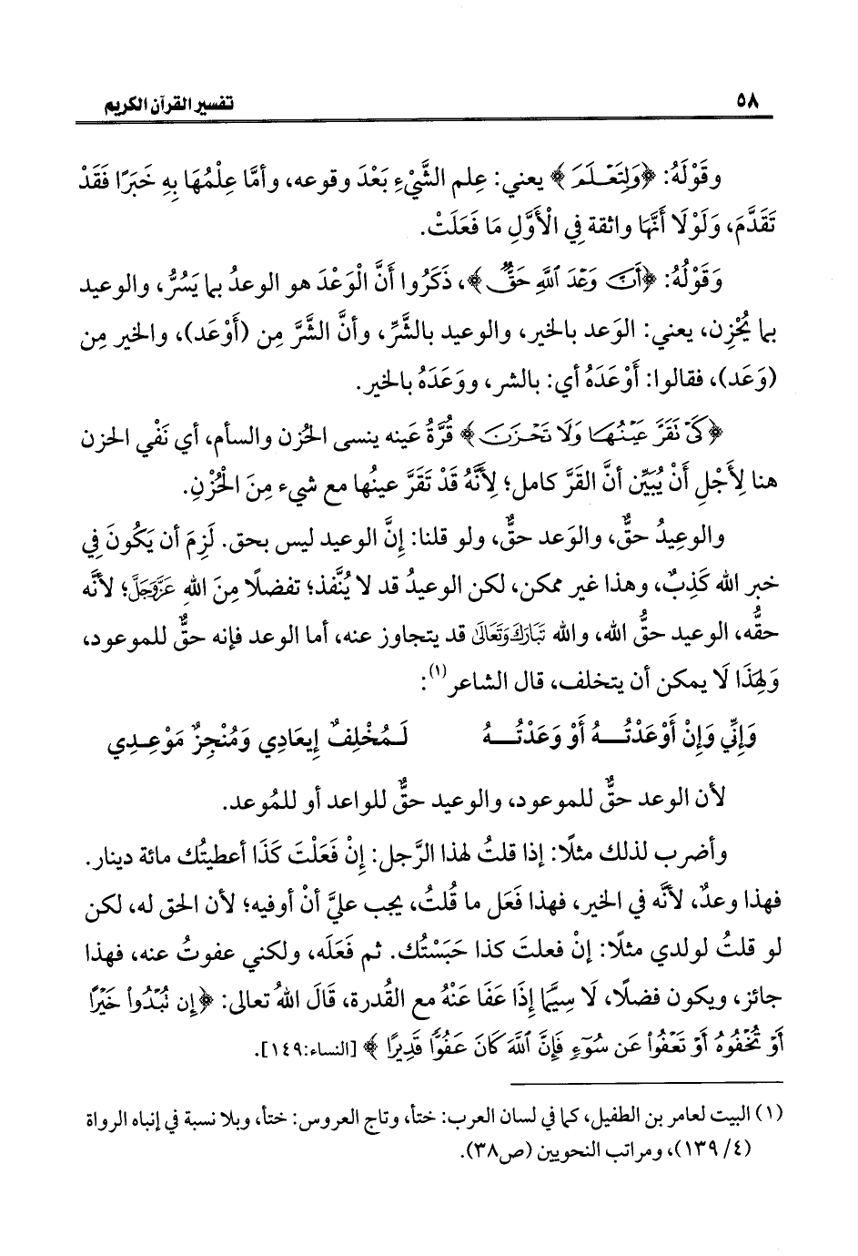 والوعِيدُ حقٌّ، والوَعد حقٌّ، ولو قلنا: إِنَّ الوعيد ليس بحق. لَزِمَ أن يَكُونَ فِي خبر اللَّه كَذِبٌ، وهذا غير ممكن، لكن الوعيدُ قد لا يُنَّفذ؛ تفضلًا مِنَ اللَّهِ عَزَّ وَجَلَّ؛ لأنَّه حقُّه، الوعيد حقُّ اللَّه، واللَّه تَبَارَكَ وَتَعَالَى قد يتجاوز عنه، أما الوعد فإنه حقٌّ للموعود، وَلِهَذَا لَا يمكن أن يتخلف، قال الشاعر (¬١):