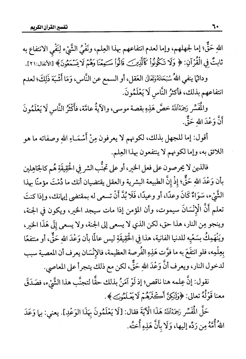 اللَّهِ حَقٌّ؛ إما لجهلهم، وإما لعدم انتفاعهم بهذا العِلم، ونَفْيُ الشَّيْء لِنَفْي الانتفاع به ثابتٌ فِي الْقُرْآنِ: {وَلَا تَكُونُوا كَالَّذِينَ قَالُوا سَمِعْنَا وَهُمْ لَا يَسْمَعُونَ} [الأنفال: ٢١].