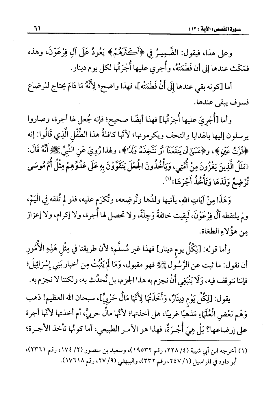 وأما [أُجْرِيَ عليها أُجرَتُها] فهذا أيضًا صحيح؛ فإنه جُعل لها أجرة، وصاروا يرسلون إليها بالهدايا والتحف ويكرمونها؛ لأنَّها كافلةُ هذا الطِّفْلِ الَّذِي قَالُوا: إنه {قُرَّتُ عَيْنٍ}، و {عَسَى أَنْ يَنْفَعَنَا أَوْ نَتَّخِذَهُ وَلَدًا}، ولهذا رُوِيَ عَنِ النَّبِيِّ -صلى اللَّه عليه وسلم- أنَّه قَالَ: "مَثَلُ الَّذِينَ يَغْزُونَ مِنْ أُمَّتِي، وَيَأْخُذُونَ الجُعْلَ يَتَقَوَّوْنَ بهِ عَلَى عَدُوِّهِمْ مِثْلُ أُمِّ مُوسَى تُرْضِعُ وَلَدَهَا وَتَأْخُذُ أَجْرَهَا" (¬١).