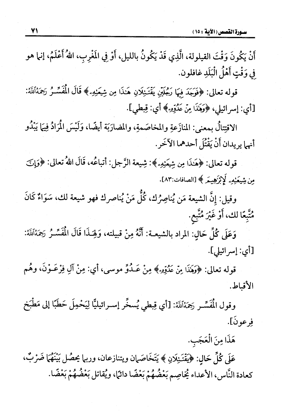 قوله تعالى: {فَوَجَدَ فِيهَا رَجُلَيْنِ يَقْتَتِلَانِ هَذَا مِنْ شِيعَتِهِ} قَالَ المُفَسِّرُ رَحِمَهُ اللَّهُ: [أي: إسرائيلي، {وَهَذَا مِنْ عَدُوِّهِ} أي: قِبطي].