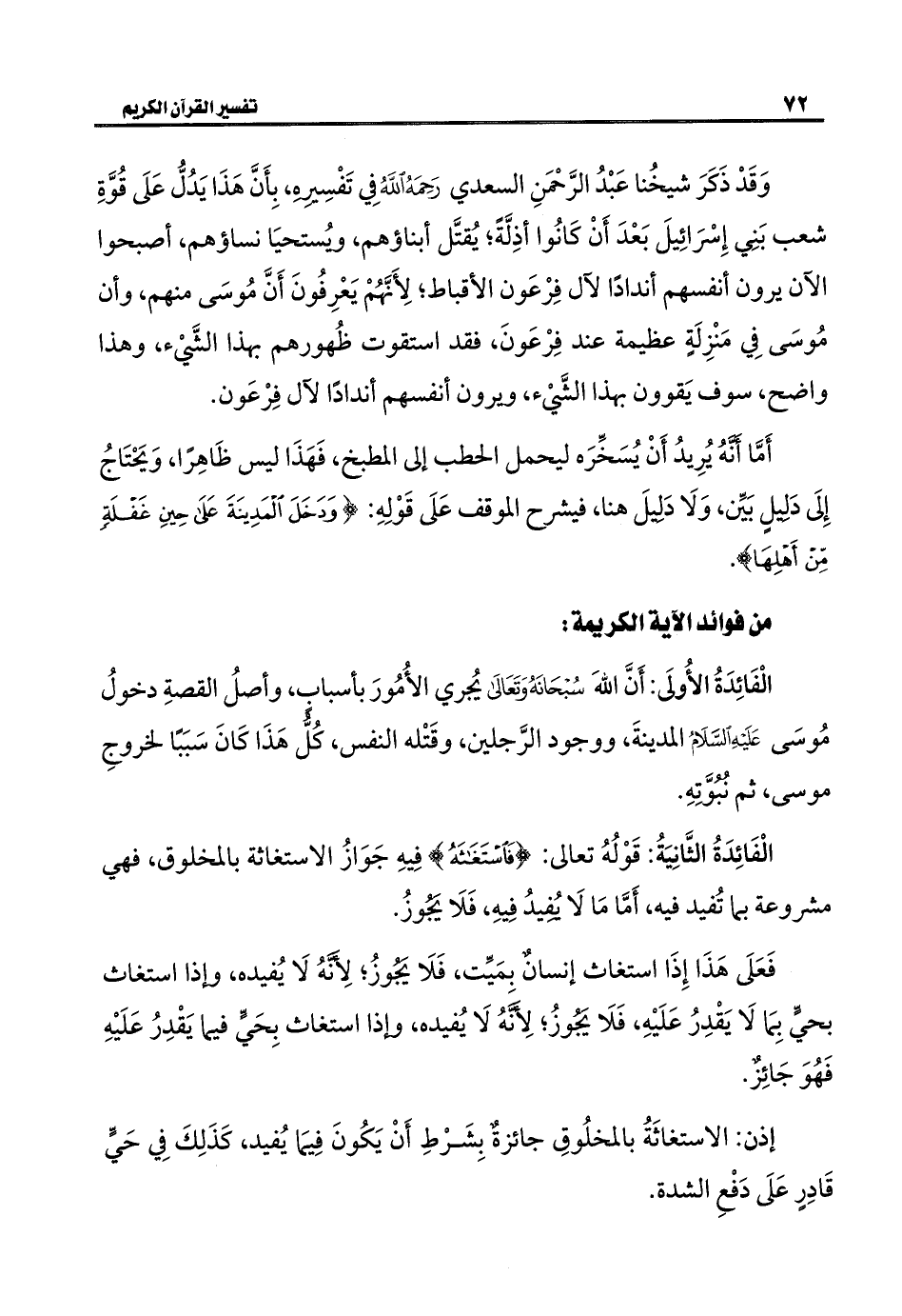 الْفَائِدَةُ الثَّانِيَةُ: قَولهُ تعالى: {فَاسْتَغَاثَهُ} فِيهِ جَوَازُ الاستغاثة بالمخلوق، فهي مشروعة بما تُفيد فيه، أَمَّا مَا لَا يُفيدُ فِيهِ، فَلَا يَجُوزُ.
