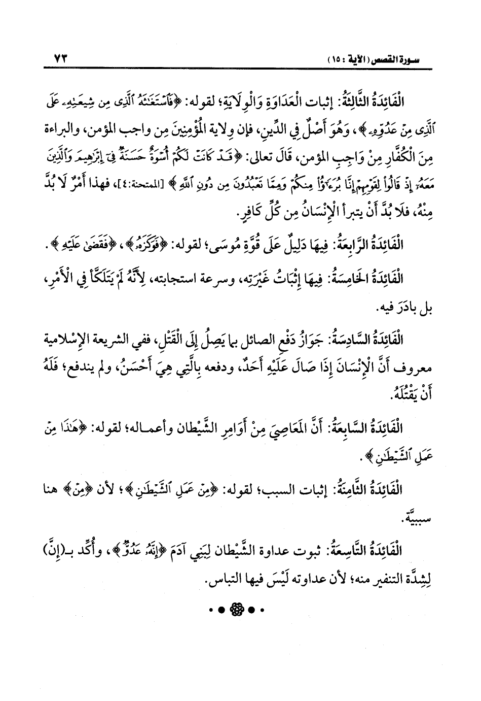 الْفَائِدَةُ الثَّالِثَةُ: إثبات الْعَدَاوةِ وَالْوِلَايَةِ؛ لقوله: {فَاسْتَغَاثَهُ الَّذِي مِنْ شِيعَتِهِ عَلَى الَّذِي مِنْ عَدُوِّهِ}، وَهُوَ أَصْلٌ فِي الدِّينِ، فإن وِلاية المُؤْمِنينَ مِن واجب المؤمن، والبراءة مِنَ الْكُفارِ مِنْ وَاجِبِ المؤمن، قَالَ تعالى: {قَدْ كَانَتْ لَكُمْ أُسْوَةٌ حَسَنَةٌ فِي إِبْرَاهِيمَ وَالَّذِينَ مَعَهُ إِذْ قَالُوا لِقَوْمِهِمْ إِنَّا بُرَآءُ مِنْكُمْ وَمِمَّا تَعْبُدُونَ مِنْ دُونِ اللَّهِ} [الممتحنة: ٤]، فهذا أَمْرٌ لابُدَّ مِنْهُ، فلَابُدَّ أَنْ يتبرأ الإِنْسَانُ مِن كُلِّ كَافِرٍ.