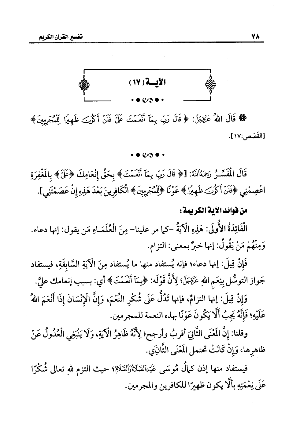 * قَالَ اللَّهُ عَزَّ وَجَلَّ: {قَالَ رَبِّ بِمَا أَنْعَمْتَ عَلَيَّ فَلَنْ أَكُونَ ظَهِيرًا لِلْمُجْرِمِينَ} [القصص: ١٧].