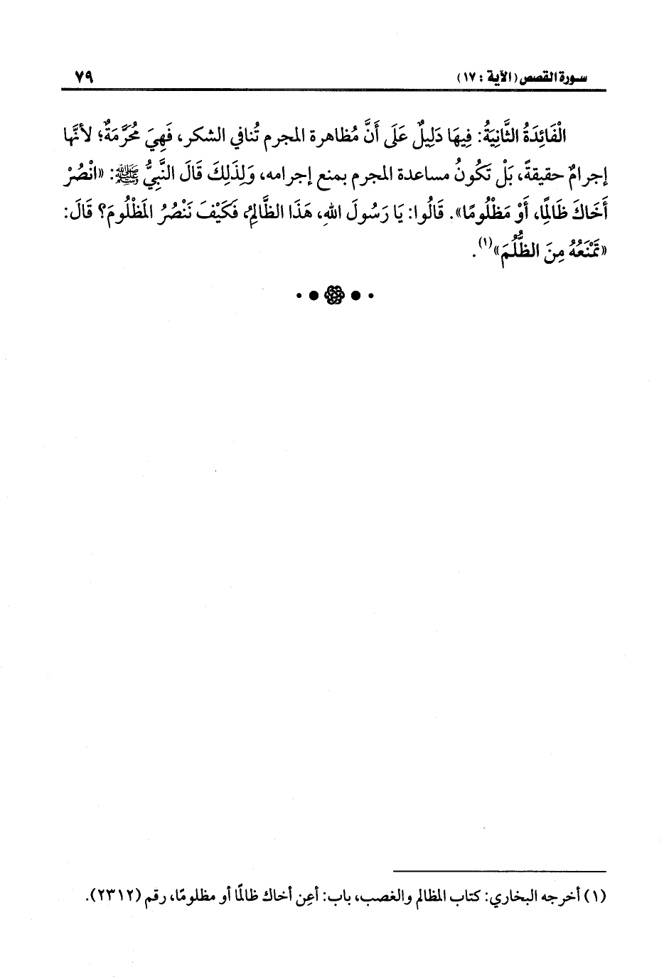الْفَائِدَةُ الثَّانِيةُ: فِيهَا دَليلٌ عَلَى أَنَّ مُظاهرة المجرم تُنافي الشكر، فَهِيَ محُرمَةٌ؛ لأنَّها إجرامٌ حقيقةَ، بَلْ تَكُونُ مساعدة المجرم بمنع إجرامه، وَلذَلِكَ قَالَ النَّبِيُّ -صلى اللَّه عليه وسلم-: "انْصُرْ أَخَاكَ ظَالمًا، أَوْ مَظْلُومًا". قَالُوا: يَا رَسُولَ اللَّهِ، هَذَا الظَّالمُ فكَيْفَ نَنْصُرُ المَظْلُومَ؟ قَالَ: "تَمْنَعُهُ مِنَ الظُّلُمَ" (¬١).