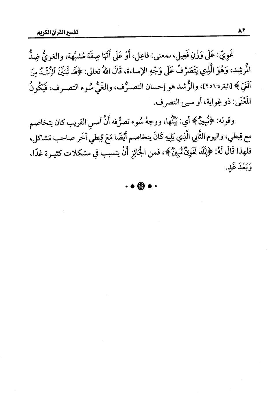 وقوله: {مُبِينٌ} أي: بَيِّنُها، ووجهُ سُوء تصرُّفه أَنَّ أمسِ القريب كان يتخاصم مع قِبطي، واليوم الثَّانِي الَّذِي يَليهِ كَانَ يتخاصم أَيْضًا مَعَ قِبطي آخَر صاحب مَشاكل، فلهذا قَالَ لَهُ: {إِنَّكَ لَغَوِيٌّ مُبِينٌ}، فمن الجْائِزِ أَنْ يتسبب في مشكلات كثيرة غدًا، وَبَعْدَ غَدٍ.