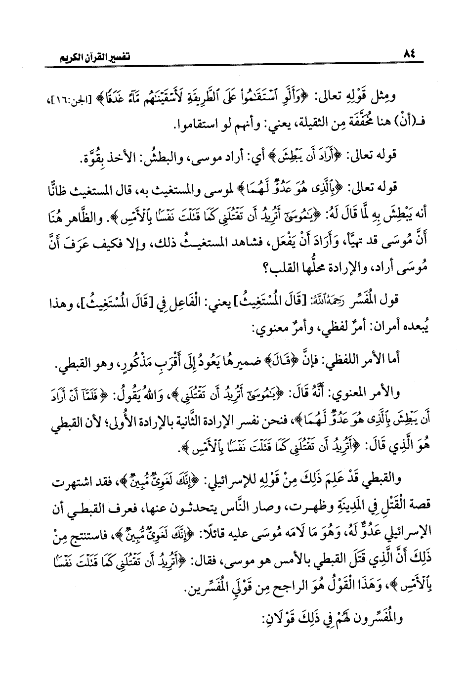 والأمر المعنوي: أنَّهُ قَالَ: {يَامُوسَى أَتُرِيدُ أَنْ تَقْتُلَنِي}، وَاللَّهُ يَقُولُ: {فَلَمَّا أَنْ أَرَادَ أَنْ يَبْطِشَ بِالَّذِي هُوَ عَدُوٌّ لَهُمَا}، فنحن نفسر الإرادة الثَّانية بالإرادة الأُولى؛ لأن القبطي هُوَ الَّذِي قَالَ: {أَتُرِيدُ أَنْ تَقْتُلَنِي كَمَا قَتَلْتَ نَفْسًا بِالْأَمْسِ}.