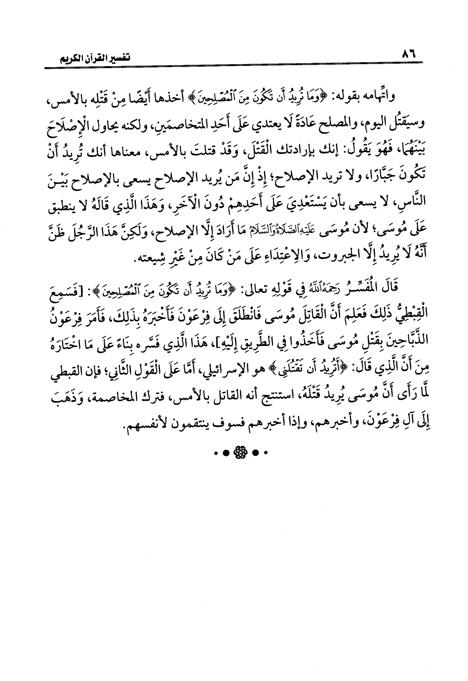 قَالَ المُفَسِّرُ رَحِمَهُ اللَّهُ فِي قَوْلِهِ تعالى: {وَمَا تُرِيدُ أَنْ تَكُونَ مِنَ الْمُصْلِحِينَ}: [فَسَمِعَ الْقِبْطِيُّ ذَلِكَ فَعَلِمَ أَنَّ الْقَاتِلَ مُوسَى فَانْطَلَقَ إِلَى فِرْعَوْنَ فَأَخْبَرَهُ بِذَلِكَ، فَأَمَرَ فِرْعَوْنُ الذَّبَّاحِينَ بِقَتْلِ مُوسَى فَأَخَذُوا فِي الطَّرِيقِ إِلَيْهِ]، هَذَا الَّذِي فَسَّره بِنَاء عَلَى مَا اخْتَارَهُ مِنَ أَنَّ الَّذِي قَالَ: {أَتُرِيدُ أَنْ تَقْتُلَنِي} هو الإسرائيلي، أَمَّا عَلَى الْقَوْلِ الثَّانِي؛ فإن القبطي لمَّا رَأَى أَنَّ مُوسَى يُرِيدُ قَتْلَهُ، استنتج أنه القاتل بالأمس، فترك المخاصمة، وَذَهَبَ إِلَى آلِ فِرْعَوْنَ، وأخبرهم، وإذا أخبرهم فسوف ينتقمون لأنفسهم.