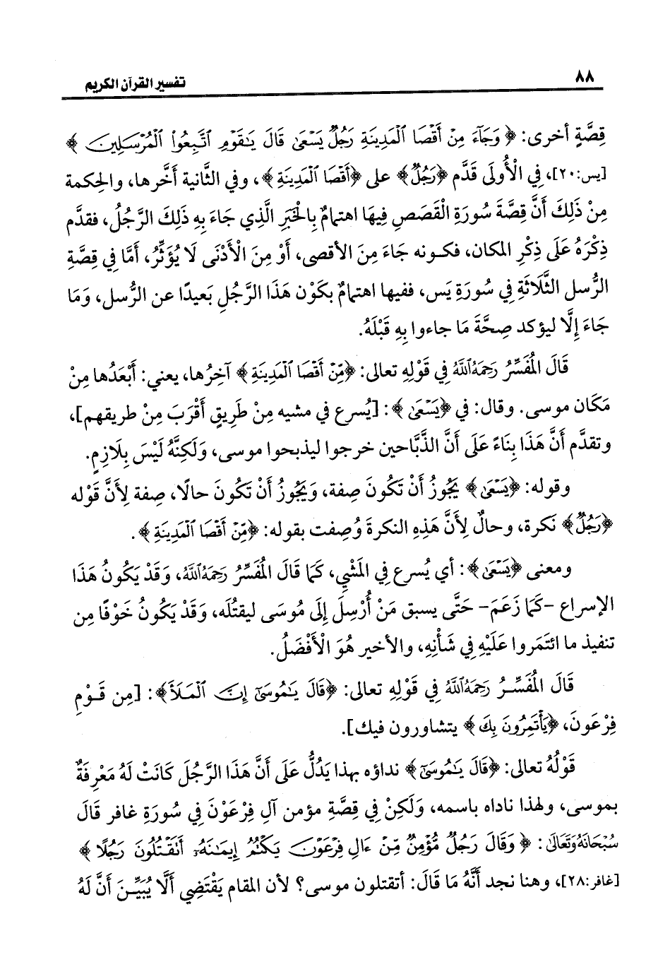 قَالَ المُفَسِّرُ رَحِمَهُ اللَّهُ فِي قَوْلِهِ تعالى: {مِنْ أَقْصَى الْمَدِينَةِ} آخِرُها، يعني: أَبْعَدُها مِنْ مَكَان موسى. وقال: في {يَسْعَى}: [يُسرع في مشيه مِنْ طَرِيقٍ أَقْرَبَ مِنْ طريقهم]، وتقدَّم أَنَّ هَذَا بِنَاءً عَلَى أَنَّ الذَّبَّاحين خرجوا ليذبحوا موسى، وَلَكِنَّهُ لَيْسَ بِلَازِمٍ.