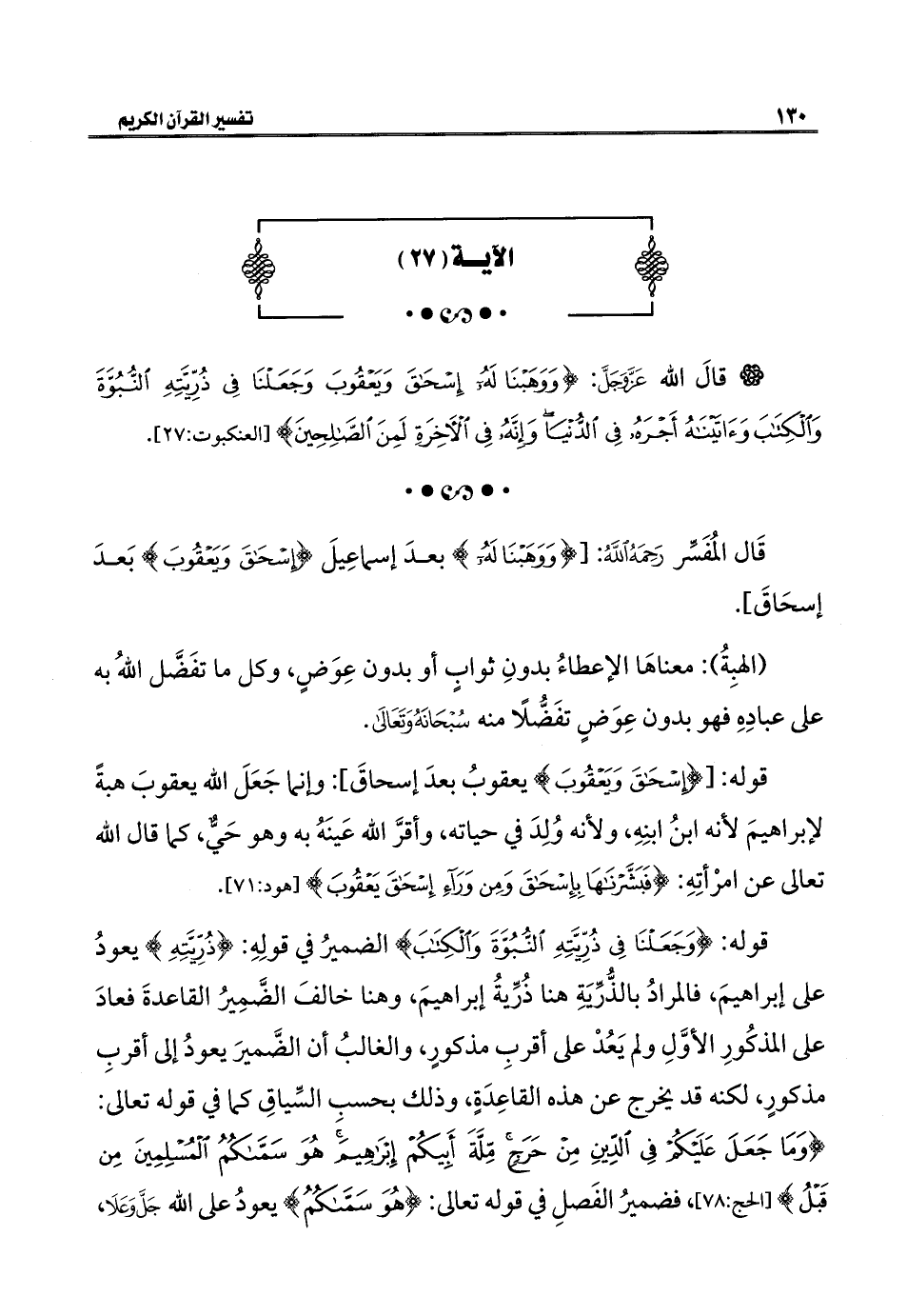 قوله: {وَجَعَلْنَا فِي ذُرِّيَّتِهِ النُّبُوَّةَ وَالْكِتَابَ} الضميرُ في قولِهِ: {ذُرِّيَّتِهِ} يعودُ على إبراهيمَ، فالمرادُ بالذُّرِّيةِ هنا ذُرِّيةُ إبراهيمَ، وهنا خالفَ الضَّمِيرُ القاعدةَ فعادَ على المذكُورِ الأوَّلِ ولم يَعُدْ على أقربِ مذكورٍ، والغالبُ أن الضَّميرَ يعودُ إلى أقربِ مذكورٍ، لكنه قد يخرج عن هذه القاعِدَة، وذلك بحسب السِّياقِ كما في قوله تعالى: {وَمَا جَعَلَ عَلَيْكُمْ فِي الدِّينِ مِنْ حَرَجٍ مِلَّةَ أَبِيكُمْ إِبْرَاهِيمَ هُوَ سَمَّاكُمُ الْمُسْلِمِينَ مِنْ قَبْلُ} [الحج: ٧٨]، فضميرُ الفَصلِ في قوله تعالى: {هُوَ سَمَّاكُمُ} يعودُ على اللَّه جلَّ وَعَلَا،